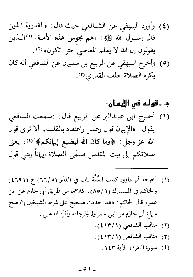 1 - أخرج ابن عبد البر عن الربيع قال: «سمعت الشافعي يقول: «الإيمان قول وعمل واعتقاد بالقلب، ألا ترى قول الله عز وجل: {وَمَا كَانَ اللَّهُ لِيُضِيعَ إِيمَانَكُمْ} [البقرة: 143]، يعني صلاتكم إلى بيت المقدس فسمى الصلاة إيمانًا وهي قول