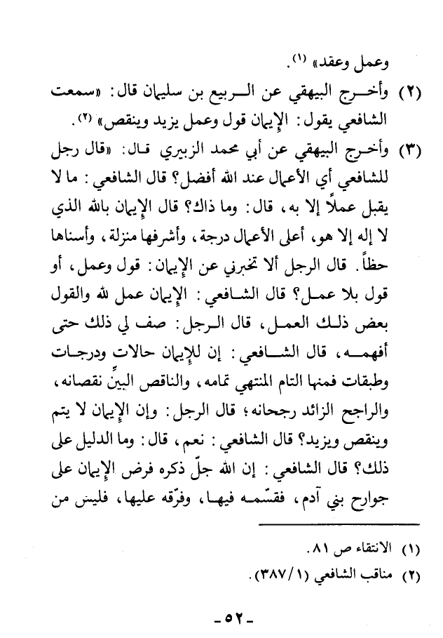 2 - وأخرج البيهقي عن الربيع بن سليمان قال: «سمعت الشافعي يقول: الإيمان قول وعمل يزيد وينقص» (¬2).
