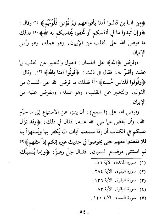 {مِنَ الَّذِينَ قَالُوا آَمَنَّا بِأَفْوَاهِهِمْ وَلَمْ تُؤْمِنْ قُلُوبُهُمْ} [المائدة: 41] وقال: {وَإِنْ تُبْدُوا مَا فِي أَنْفُسِكُمْ أَوْ تُخْفُوهُ يُحَاسِبْكُمْ بِهِ اللَّهُ} [البقرة: 284] فذلك ما فرض الله على القلب من الإيمان، وهو عمله، وهو رأس الإيمان.
