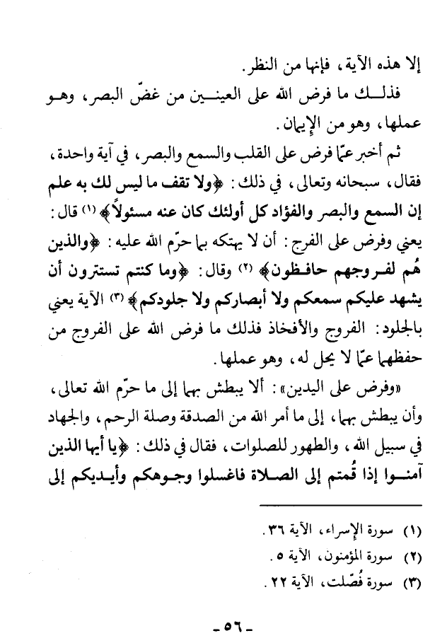 ثم أخبر عما فرض على القلب والسمع والبصر، في آية واحدة، فقال، سبحانه وتعالى، في ذلك: {وَلَا تَقْفُ مَا لَيْسَ لَكَ بِهِ عِلْمٌ إِنَّ السَّمْعَ وَالْبَصَرَ وَالْفُؤَادَ كُلُّ أُولَئِكَ كَانَ عَنْهُ مَسْئُولًا} [الإسراء: 36] قال: يعني وفرض على الفرج: أن لا يهتكه بما حرم الله عليه: {وَالَّذِينَ هُمْ لِفُرُوجِهِمْ حَافِظُونَ} [المؤمنون: 5]، وقال: {وَمَا كُنْتُمْ تَسْتَتِرُونَ أَنْ يَشْهَدَ عَلَيْكُمْ سَمْعُكُمْ وَلَا أَبْصَارُكُمْ وَلَا جُلُودُكُمْ} [فصلت: 22] الآية يعني بالجلود: الفروج والأفخاذ فذلك ما فرض الله على الفروج من حفظهما عمّا لا يحل له، وهو عملها.