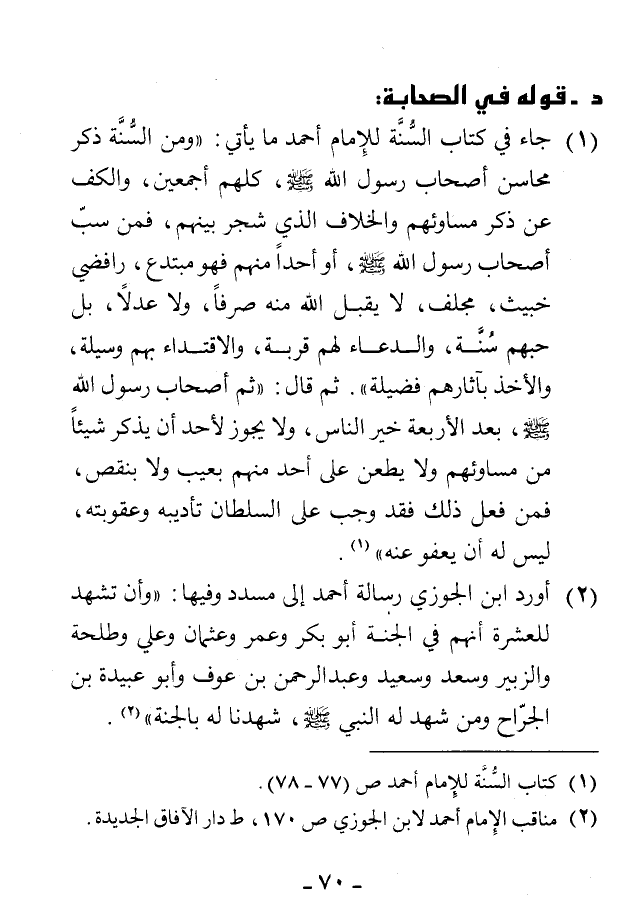 1 - جاء في كتاب السُّنَّة للإمام أحمد ما يأتي: «ومن السُّنَّة ذكر محاسن أصحاب رسول الله - صَلَّى اللهُ عَلَيْهِ وَسَلَّمَ -، كلهم أجمعين، والكف عن ذكر مساوئهم والخلاف الذي شجر بينهم، فمن سبّ أصحاب رسول الله - صَلَّى اللهُ عَلَيْهِ وَسَلَّمَ -، أو أحدًا منهم فهو مبتدع، رافضي خبيث، مجلف، لا يقبل الله منه صرفًا، ولا عدلاً، بل حبهم سُنَّة، والدعاء لهم قربة، والاقتداء بهم وسيلة، والأخذ بآثارهم فضيلة».
