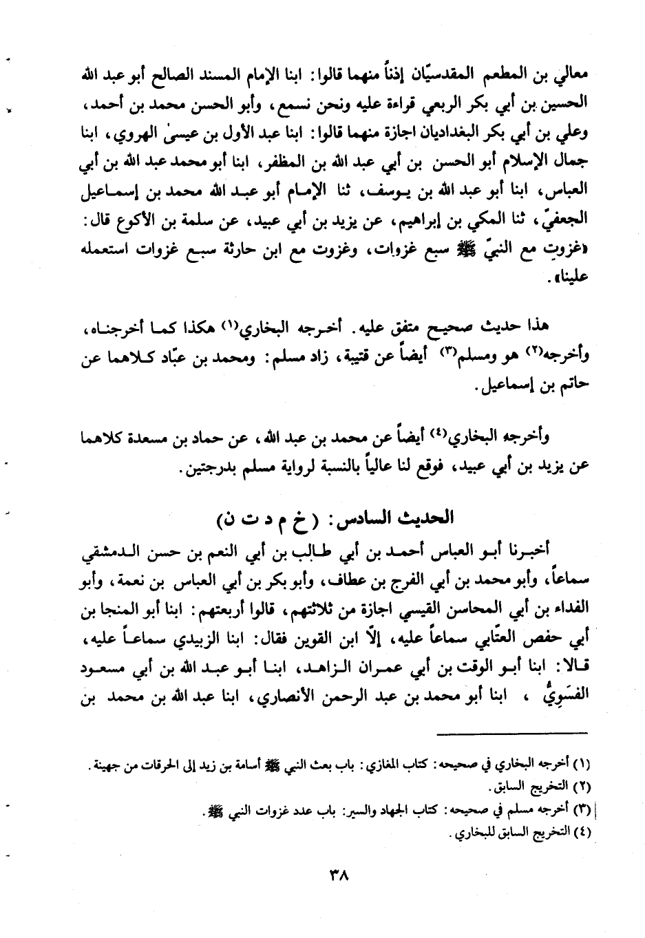مَعَالِي بْنِ الْمُطْعِمِ الْمَقْدِسِيَّانِ، إِذْنًا مِنْهُمَا، قَالُوا: أنبا الإِمَامُ الْمُسْنِدُ الصَّالِحُ أَبُو عَبْدِ اللَّهِ الْحُسَيْنُ بْنُ أَبِي بَكْرٍ الرَّبَعِيُّ، قِرَاءَةً عَلَيْهِ، وَنَحْنُ نَسْمَعُ، وَأَبُو الْحَسَنِ مُحَمَّدُ بْنُ أَحْمَدَ، وَعَلِيُّ بْنُ أَبِي بَكْرٍ الْبَغْدَادِيَّانِ، إِجَازَةً مِنْهُمَا , قَالُوا: أنبا عَبْدُ الأَوَّلِ بْنُ عِيسَى الْهَرَوِيُّ، أنبا جَمَالُ الإِسْلامِ أَبُو الْحَسَنِ بْنُ أَبِي عَبْدِ اللَّهِ بْنِ الْمُظَفَّرِ، أنبا أَبُو مُحَمَّدٍ عَبْدُ اللَّهِ بْنُ أَبِي الْعَبَّاسِ، أنبا أَبُو عَبْدِ اللَّهِ بْنُ يُوسُفَ، ثنا الإِمَامُ أَبُو عَبْدِ اللَّهِ مُحَمَّدُ بْنُ إِسْمَاعِيلَ الْجُعْفِيُّ، ثنا الْمَكِّيُّ بْنُ إِبْرَاهِيمَ، عَنْ يَزِيدَ بْنِ أَبي عُبَيْدٍ، عَنْ سَلَمَةَ بْنِ الأَكْوَعِ , قَالَ: غَزَوْتُ مَعَ النَّبِيِّ صَلَّى اللَّهُ عَلَيْهِ وَسَلَّمَ سَبْعَ غَزَوَاتٍ، وَغَزَوْتُ مَعَ ابْنِ حَارِثَةَ سَبْعَ غَزَوَاتٍ اسْتَعْمَلَهُ عَلَيْنَا ".