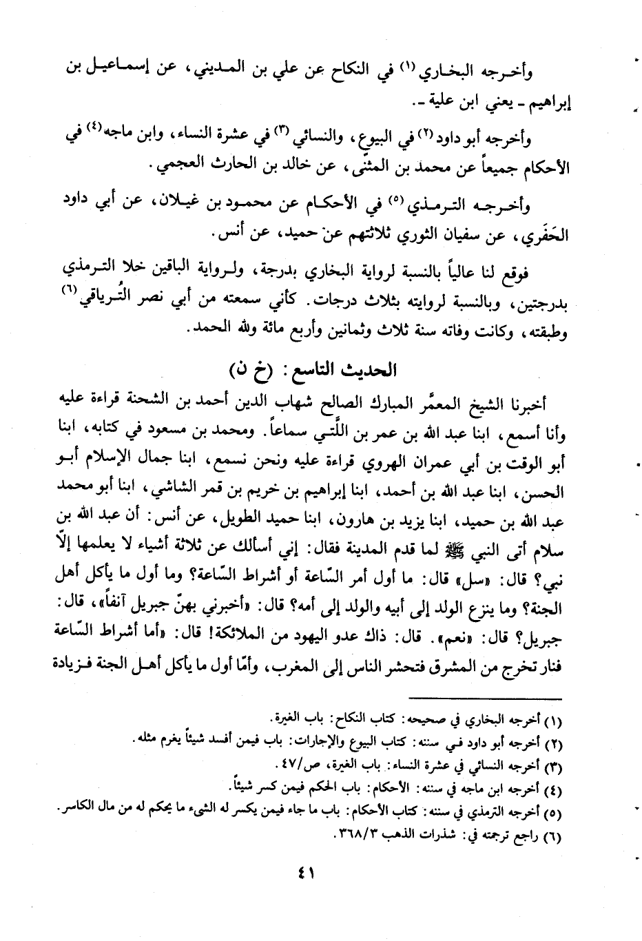 أَخْبَرَنَا الشَّيْخُ الْمُعَمِّرُ الْمُبَارَكُ صَالِحُ شِهَابُ الدِّينِ بْنُ أَحْمَدَ بْنِ الشِّحْنَةِ قِرَاءَةً عَلَيْهِ، وَأَنَا أَسْمَعُ، أَنْبَأَ عَبْدُ اللَّهِ بْنُ عُمَرَ بْنِ اللَّتِّيِّ سَمَاعًا، وَمُحَمَّدُ بْنُ مَسْعُودٍ فِي كِتَابِهِ، أنبا أَبُو الْوَقْتِ بْنُ أَبِي عِمْرَانَ الْهَرَوِيُّ، قِرَاءَةً عَلَيْهِ وَنَحْنُ نَسْمَعُ، أنبا جَمَالُ الإِسْلامِ أَبُو الْحَسَنِ، أَنْبَأَ عَبْدُ اللَّهِ بْنُ أَحْمَدَ، أَنْبَأَ إِبْرَاهِيمُ بْنُ خُرَيْمِ بْنِ قَمَرٍ اللَّخْمِيُّ الشَّاشِيُّ، أَنْبَأَ أَبُو مُحَمَّدِ عَبْدُ بْنُ حُمَيْدٍ، أَنْبَأَ يَزِيدُ بْنُ هَارُونَ، أَنْبَأَ حُمَيْدٌ الطَّوِيلُ، عَنْ أَنَسِ بْنِ مَالِكٍ، أَنَّ عَبْدَ اللَّهِ بْنَ سَلامٍ، أَتَى النَّبِيَّ صَلَّى اللَّهُ عَلَيْهِ وَسَلَّمَ لَمَّا قَدِمَ الْمَدِينَةَ فَقَالَ: إِنِّي أَسْأَلُكَ عَنْ ثَلاثَةِ أَشْيَاءَ لا يَعْلَمُهُنَّ إِلا نَبِيٌّ: مَا أَوَّلُ أَمْرِ السَّاعَةِ أَوْ أَشْرَاطِ السَّاعَةِ؟ وَمَا أَوَّلُ مَا يَأْكُلُ أَهْلُ الْجَنَّةِ؟ وَمَا يَنْزِعُ الْوَلَدُ إِلَى أَبِيهِ وَالْوَلَدُ إِلَى أُمِّهِ قَالَ: أَخْبَرَنِي بِهِنَّ جِبْرِيلُ آنِفًا.