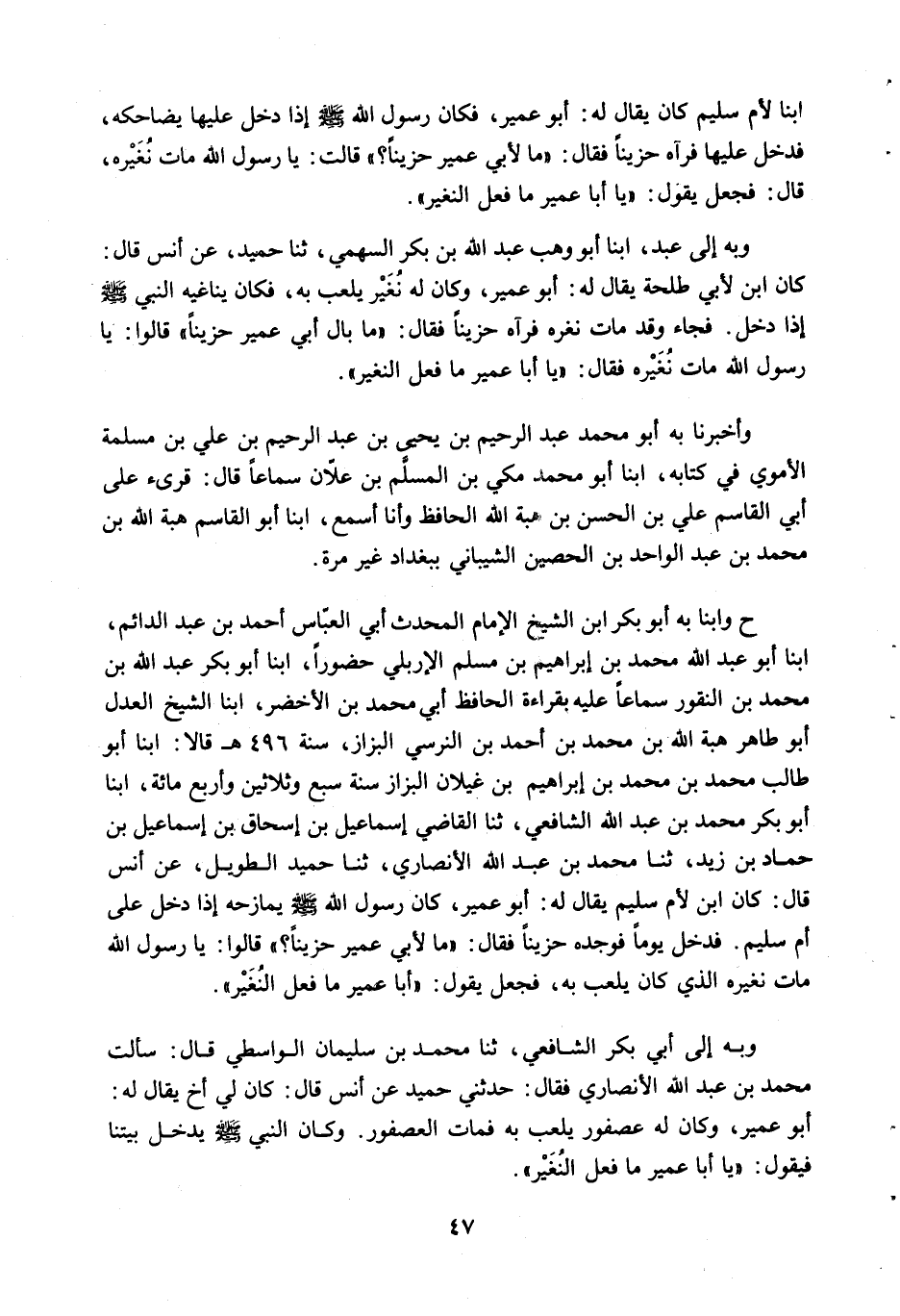 ح وَأَنبا بِهِ أَبُو بَكْرِ بْنُ الشَّيْخِ الإِمَامِ الْمُحَدِّثِ أَبِي الْعَبَّاسِ أَحْمَدَ بْنِ عَبْدِ الدَّائِمِ، أنبا أَبُو عَبْدِ اللَّهِ مُحَمَّدُ بْنُ إِبْرَاهِيمَ بْنِ مُسْلِمٍ الإِرْبِلِيُّ، حُضُورًا، أنبا أَبُو بَكْرٍ عَبْدُ اللَّهِ بْنُ مُحَمَّدِ بْنِ النَّقُّورِ، سَمَاعًا عَلَيْهِ، بِقِرَاءَةِ الْحَافِظِ أَبِي مُحَمَّدٍ الأَخْضَرِ، أنبا الشَّيْخُ الْعَدْلُ أَبُو طَاهِرٍ هِبَةُ اللَّهِ بْنُ مُحَمَّدِ بْنِ أَحْمَدَ بْنِ النَّرْسِيِّ الْبَزَّازُ سَنَةَ 496 هـ، قَالا: أنبا أَبُو طَالِبٍ مُحَمَّدُ بْنُ مُحَمَّدِ بْنِ إِبْرَاهِيمَ بْنِ غَيْلانَ الْبَزَّازُ، سَنَةَ سَبْعٍ وَثَلاثِينَ وَأَرْبَعِ مِائَةٍ، أنبا أَبُو بَكْرٍ مُحَمَّدُ بْنُ عَبْدِ اللَّهِ الشَّافِعِيُّ، ثنا الْقَاضِي إِسْمَاعِيلُ بْنُ إِسْحَاقَ بْنِ إِسْمَاعِيلَ بْنِ حَمَّادِ بْنِ زَيْدٍ، ثنا مُحَمَّدُ بْنُ عَبْدِ اللَّهِ الأَنْصَارِيُّ، ثنا حُمَيْدٌ الطَّوِيلُ، عَنْ أَنَسٍ، قَالَ: كَانَ ابْنُ لأُمِّ سُلَيْمٍ يُقَالُ لَهُ: أَبُو عُمَيْرٍ كَانَ رَسُولُ اللَّهِ صَلَّى اللَّهُ عَلَيْهِ وَسَلَّمَ يُمَازِحُهُ إِذَا دَخَلَ عَلَى أُمِّ سُلَيْمٍ، فَدَخَلَ يَوْمًا، فَوَجَدَهُ حَزِينًا، فَقَالَ: «مَا لأَبِي عُمَيْرٍ حَزِينًا؟» قَالُوا: يَا رَسُولَ اللَّهِ مَاتَ نُغَيْرُهُ الَّذِي كَانَ يَلْعَبُ بِهِ، فَجَعَلَ يَقُولُ: «أَبَا عُمَيْرٍ مَا فَعَلَ النُّغَيْرُ؟» .