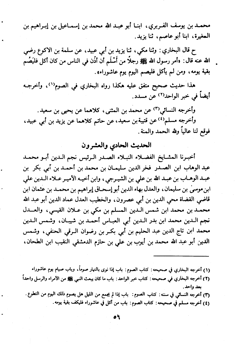 ح قَالَ الْبُخَارِيُّ: وَثنا مَكِّيٌّ، ثنا يَزِيدُ بْنُ أَبِي عُبَيْدٍ، عَنْ سَلَمَةَ بْنِ الأَكْوَعِ، رَضِيَ اللَّهُ عَنْهُ، قَالَ: أَمَرَ رَسُولُ اللَّهِ صَلَّى اللَّهُ عَلَيْهِ وَسَلَّمَ رَجُلا مِنْ أَسْلَمَ أَنْ «أَذِّنْ فِي النَّاسِ، مَنْ كَانَ أَكَلَ فَلْيَصُمْ بَقِيَّةَ يَوْمِهِ , وَمَنْ لَمْ يَأْكُلْ فَلْيَصُمْ، الْيَوْمُ يَوْمُ عَاشُورَاءَ» .