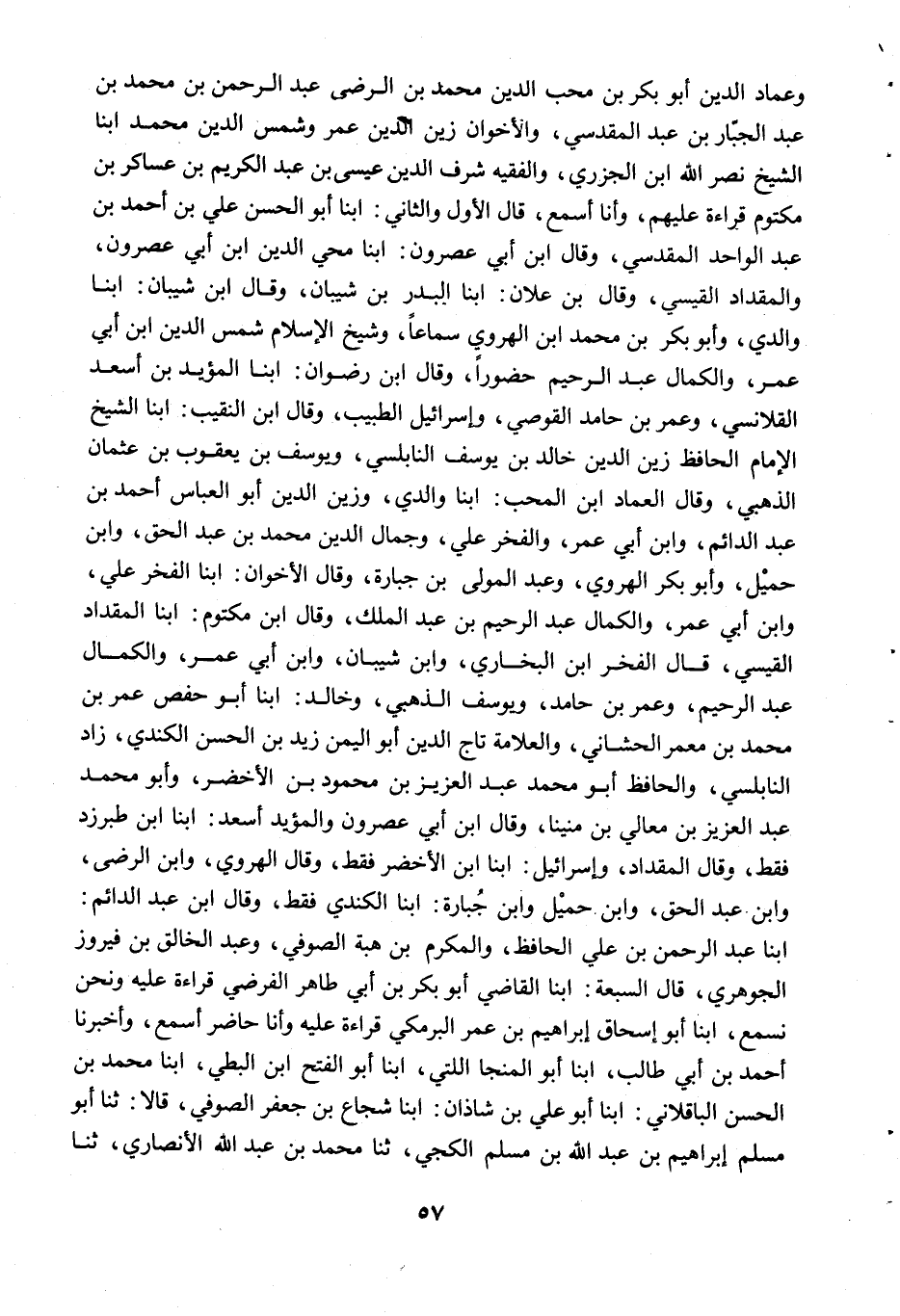 وَعِمَادُ الدِّينِ أَبُو بَكْرِ بْنُ مُحِبِّ الدِّينِ مُحَمَّدِ بْنِ الرَّضِيِّ عَبْدِ الرَّحْمَنِ بْنِ مُحَمَّدِ بْنِ عَبْدِ الْجَبَّارِ بْنِ عَبْدٍ الْمَقْدِسِيُّ، وَالأَخَوَانِ زَيْنُ الدِّينِ عُمَرُ، وَشَمْسُ الدِّينِ مُحَمَّدٌ، ابْنَا الشَّيْخِ نَصْرِ اللَّهِ بْنِ الْجَزَرِيِّ، وَالْفَقِيهُ شَرَفُ الدِّينِ عِيسَى بْنُ عَبْدِ الْكَرِيمِ بْنِ عَسَاكِرَ بْنِ مَكْتُومٍ، قِرَاءَةً عَلَيْهِمْ، وَأَنَا أَسْمَعُ، قَالَ الأَوَّلُ، وَالثَّانِي: أنبا أَبُو الْحَسَنِ عَلِيُّ بْنُ أَحْمَدَ بْنِ عَبْدِ الْوَاحِدِ الْمَقْدِسِيُّ، وَقَالَ ابْنُ أَبِي عَصْرُونَ: أنبا مُحْيِي الدِّينِ بْنُ أَبِي عَصْرُونَ، وَالْمِقْدَادُ الْقَيْسِيُّ، وَقَالَ ابْنُ عَلانَ: أنبا الْبَدْرُ بْنُ شَيْبَانَ، وَقَالَ ابْنُ شَيْبَانَ: أنبا وَالِدِي، وَأَبُو بَكْرِ بْنُ مُحَمَّدِ بْنِ الْهَرَوِيِّ 9، سَمَاعًا، وَشَيْخُ الإِسْلامِ شَمْسُ الدِّينِ بْنُ أَبِي عُمَرَ، وَالْكَمَالُ عَبْدُ الرَّحِيمِ، حُضُورًا، وَقَالَ ابْنُ رِضْوَانَ: أنبا الْمُؤَيَّدُ بْنُ أَسْعَدَ الْقَلانِسِيُّ، وَعُمَرُ بْنُ حَامِدٍ الْقَوْصِيُّ، وَإِسْرَائِيلُ الطَّبِيبُ، وَقَالَ ابْنُ النَّقِيبِ: أنبا الشَّيْخُ الإِمَامُ الْحَافِظُ زَيْنُ الدِّينِ خَالِدُ بْنُ يُوسُفَ النَّابُلُسِيُّ، وَيُوسُفُ بْنُ يَعْقُوبَ بْنِ عُثْمَانَ الذَّهَبِيُّ، وَقَالَ الْعِمَادُ بْنُ الْمُحِبِّ: أنبا وَالِدِي، وَزَيْنُ الدِّينِ أَبُو الْعَبَّاسِ أَحْمَدُ بْنُ عَبْدِ الدَّائِمِ، وَابْنُ أَبِي عُمَرَ، وَالْفَخْرُ عَلِيٌّ، وَجَمَالُ الدِّينِ مُحَمَّدُ بْنُ عَبْدِ الْحَقِّ، وَابْنُ جَمِيلٍ، وَأَبُو بَكْرٍ الْهَرَوِيُّ، وَعَبْدُ الْمَوْلَى بْنُ جُبَارَةَ، وَقَالَ الأَخَوَانِ: أنبا الْفَخْرُ عَلِيٌّ، وَابْنُ أَبِي عُمَرَ، وَالْكَمَالُ عَبْدُ الرَّحِيمِ بْنُ عَبْدِ الْمَلِكِ، وَقَالَ ابْنُ مَكْتُومٍ: أنبا الْمِقْدَادُ الْقَيْسِيُّ، قَالَ الْفَخْرُ بْنُ الْبُخَارِيِّ، وَابْنُ شَيْبَانَ وَابْنُ أَبِي عُمَرَ، وَالْكَمَالُ عَبْدُ الرَّحِيمِ، وَعُمَرُ بْنُ حَامِدٍ، وَيُوسُفُ الذَّهَبِيُّ، وَخَالِدٌ: أنبا أَبُو حَفْصٍ عُمَرُ بْنُ مُحَمَّدِ بْنِ مَعْمَرٍ الْحشَانِيُّ، وَالْعَلامَةُ تَاجُ الدِّينِ أَبُو الْيُمْنِ زَيْدُ بْنُ الْحَسَنِ الْكنْدِيُّ، زَادَ النَّابُلُسِيُّ، وَالْحَافِظُ أَبُو مُحَمَّدٍ عَبْدُ الْعَزِيزِ بْنُ مَحْمُودِ بْنِ الأَخْضَرِ، وَأَبُو مُحَمَّدٍ عَبْدُ الْعَزِيزِ بْنُ مَعَالِي بْنِ منينا، وَقَالَ ابْنُ أَبِي عَصْرُونَ، وَالْمُؤَيَّدُ أَسْعَدُ، أنبا ابْنُ طَبَرْزُدَ فَقَطْ، وَقَالَ الْمِقْدَادُ، وَإِسْرَائِيلُ: أنبا ابْنُ الأَخْضَرِ فَقَطْ، وَقَالَ الْهَرَوِيُّ، وَابْنُ الرّضي، وَابْنُ عَبْدِ الْحَقِّ، وَابْنُ جَمِيلٍ، وَابْنُ جُبَارَةَ: أنبا الْكِنْدِيُّ فَقَطْ، وَقَالَ ابْنُ عَبْدِ الدَّائِمِ: أنبا عَبْدُ الرَّحْمَنِ بْنُ عَلِيٍّ الْحَافِظُ، وَالْمُكْرَمُ بْنُ هِبَةِ اللَّهِ الصُّوفِيُّ، وَعَبْدُ الْخَالِقِ بْنُ فَيْرُوزَ الْجَوْهَرِيُّ، قَالَ السَّبْعَةُ: أنبا الْقَاضِي أَبُو بَكْرِ بْنُ أَبِي طَاهِرٍ الْفَرَضِيُّ، قِرَاءَةً عَلَيْهِ، وَنَحْنُ نَسْمَعُ، أنبا أَبُو إِسْحَاقَ إِبْرَاهِيمُ بْنُ عُمَرَ الْبَرْمَكِيُّ، قِرَاءَةً عَلَيْهِ، وَأَنَا حَاضِرٌ أَسْمَعُ، وَأَخْبَرَنَا أَحْمَدُ بْنُ أَبِي طَالِبٍ، أنبا أَبُو الْمُنَجَّا بْنُ اللَّتِّيِّ، أنبا أَبُو الْفَتْحِ بْنُ الْبَطِّيِّ الذَّهَبِيُّ، وَقَالَ: أنا الشَّيْخُ الإِمَامُ الْحَافِظُ زَيْنُ الدِّينِ خَالِدُ بْنُ يُوسُفَ النَّابُلُسِيُّ، وَيُوسُفُ بْنُ يَعْقُوبَ بْنِ عُثْمَانَ...........................