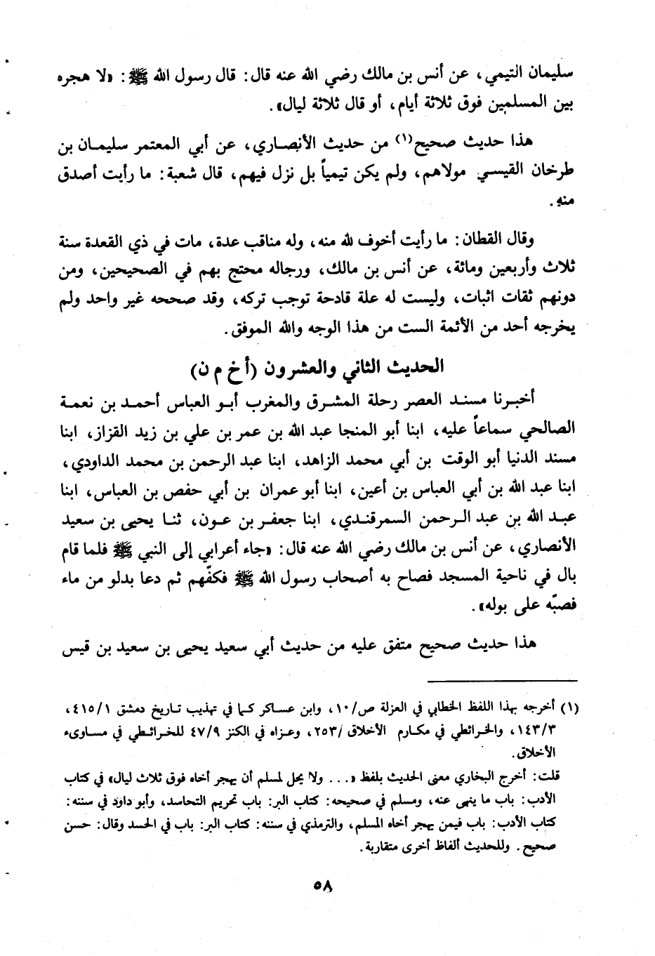 سُلَيْمَانُ التَّيْمِيُّ، عَنْ أَنَسِ بْنِ مَالِكٍ، رَضِيَ اللَّهُ عَنْهُ، قَالَ: قَالَ رَسُولُ اللَّهِ صَلَّى اللَّهُ عَلَيْهِ وَسَلَّمَ: «لا هِجْرَةَ بَيْنَ الْمُسْلِمِينَ فَوْقَ ثَلاثَةِ أَيَّامٍ» .