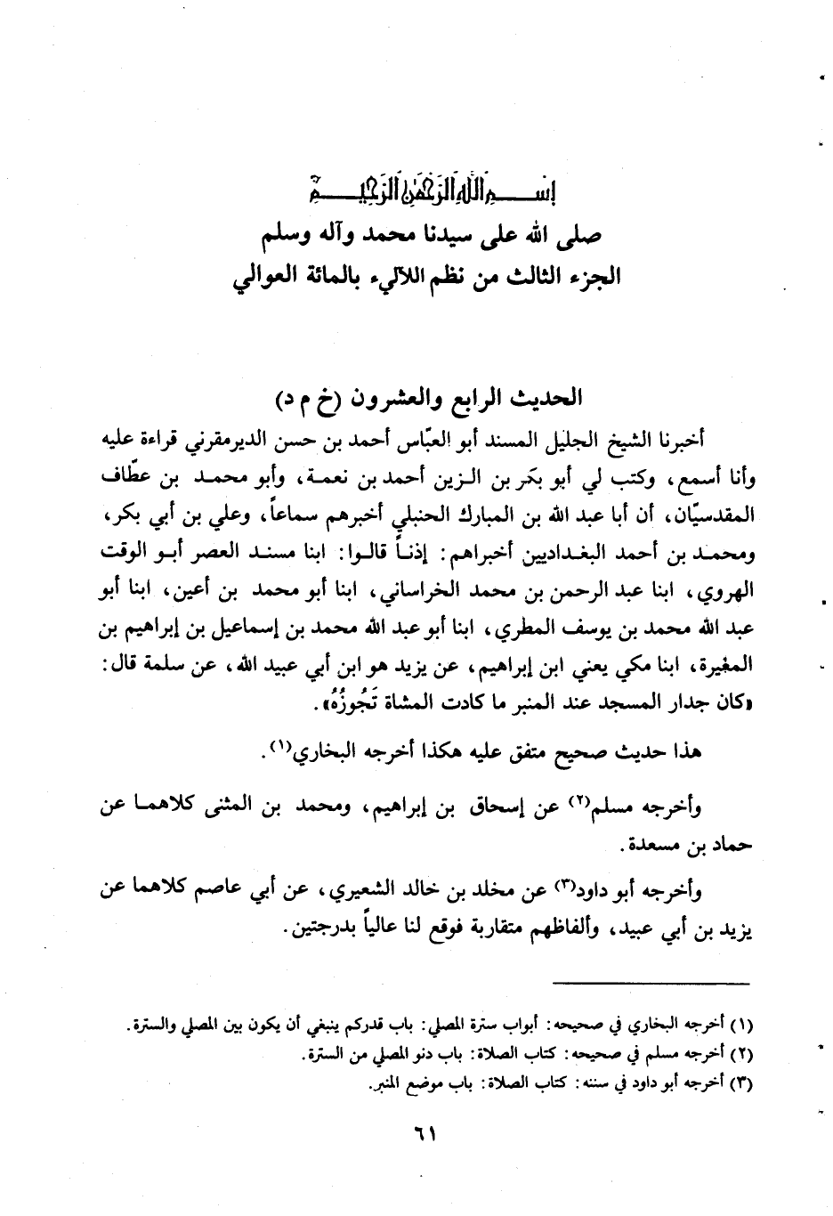 أَخْبَرَنَا الشَّيْخُ الْجَلِيلُ الْمُسْنِدُ أَبُو الْعَبَّاسِ أَحْمَدُ بْنُ حَسَنٍ الدّيرمقرنِيُّ، قِرَاءَةً عَلَيْهِ، وَأَنَا أَسْمَعُ، وَكَتَبَ لِي أَبُو بَكْرِ بْنُ الزَّيْنِ أَحْمَدَ بْنِ نِعْمَةَ، وَأَبُو مُحَمَّدِ بْنُ عَطَّافٍ، الْمَقْدِسِيَّانِ، أَنَّ أَبَا عَبْدِ اللَّهِ بْنِ الْمُبَارَكِ الْحَنْبَلِيَّ، أَخْبَرَهُمْ سَمَاعًا، وَعَلِيَّ بْنَ أَبِي بَكْرٍ، وَمُحَمَّدَ بْنَ أَحْمَدَ الْبَغْدَادِيَّيْنِ، أَخْبَرَاهُمْ، إِذْنًا قَالُوا: أنبا مُسْنِدُ الْعَصْرِ أَبُو الْوَقْتِ الْهَرَوِيُّ، أنا عَبْدُ الرَّحْمَنِ بْنُ مُحَمَّدٍ الْخُرَاسَانِيُّ، أنبا أَبُو مُحَمَّدِ بْنُ أَعْيَنَ، أنبا أَبُو عَبْدِ اللَّهِ مُحَمَّدُ بْنُ يُوسُفَ الْمَطَرِيُّ، أنبا أَبُو عَبْدِ اللَّهِ مُحَمَّدُ بْنُ إِسْمَاعِيلَ بْنِ إِبْرَاهِيمَ بْنِ الْمُغِيرَةِ، أنبا مَكِّيٌّ يَعْنِي ابْنَ إِبْرَاهِيمَ، عَنْ يَزِيدَ هُوَ ابْنُ أَبِي عُبَيْدِ اللَّهِ، عَنْ سَلَمَةَ، قَالَ: «كَانَ جِدَارُ الْمَسْجِدِ عِنْدَ الْمِنْبَرِ مَا كَادَتِ الْمُشَاةُ تَجُوزُهُ» .