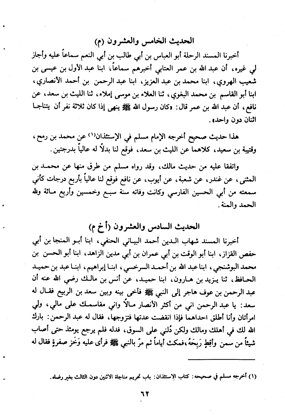 أَخْبَرَنَا الْمُسْنِدُ الرِّحْلَةُ أَبُو الْعَبَّاسِ بْنُ أَبِي طَالِبِ بْنِ أَبِي النّعمِ، سَمَاعًا عَلَيْهِ، وَأَجَازَ لِي غَيْرُهُ، أَنَّ عَبْدَ اللَّهِ بْنَ عُمَرَ الْعَتَّابِيَّ، أَخْبَرَهُمْ سَمَاعًا، أنا عَبْدُ الأَوَّلِ بْنُ عِيسَى بْنِ شُعَيْبٍ الْهَرَوِيُّ، أنبا مُحَمَّدُ بْنُ عَبْدِ الْعَزِيزِ، أنبا عَبْدُ الرَّحْمَنِ بْنُ أَحْمَدَ الأَنْصَارِيُّ، أنبا أَبُو الْقَاسِمِ بْنُ مُحَمَّدٍ الْبَغَوِيُّ، ثنا الْعَلاءُ بْنُ مُوسَى إِمْلاءً، ثنا اللَّيْثُ بْنُ سَعْدٍ، عَنْ نَافِعٍ، أَنَّ عَبْدَ اللَّهِ بْنَ عُمَرَ، قَالَ: كَانَ رَسُولُ اللَّهِ صَلَّى اللَّهُ عَلَيْهِ وَسَلَّمَ «يَنْهَى إِذَا كَانَ ثَلاثَةُ نَفَرٍ أَنْ يَتَنَاجَى اثْنَانِ دُونَ وَاحِدٍ» .