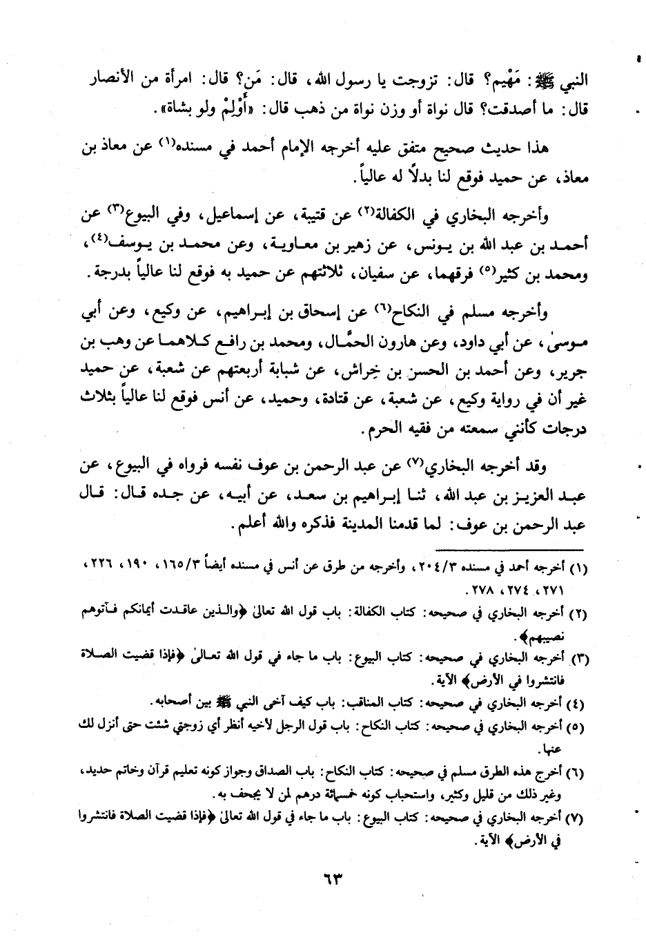 وَقَدْ أَخْرَجَهُ الْبُخَارِيُّ، عَنْ عَبْدِ الرَّحْمَنِ بْنِ عَوْفٍ نَفْسِهِ، فَرَوَاهُ فِي الْبُيُوعِ، عَنْ عَبْدِ الْعَزِيزِ بْنِ عَبْدِ اللَّهِ، ثنا إِبْرَاهِيمُ بْنُ سَعْدٍ، عَنْ أَبِيهِ، عَنْ جَدِّهِ، قَالَ: قَالَ عَبْدُ الرَّحْمَنِ بْنُ عَوْفٍ: «لَمَّا قَدِمْنَا الْمَدِينَةَ» .