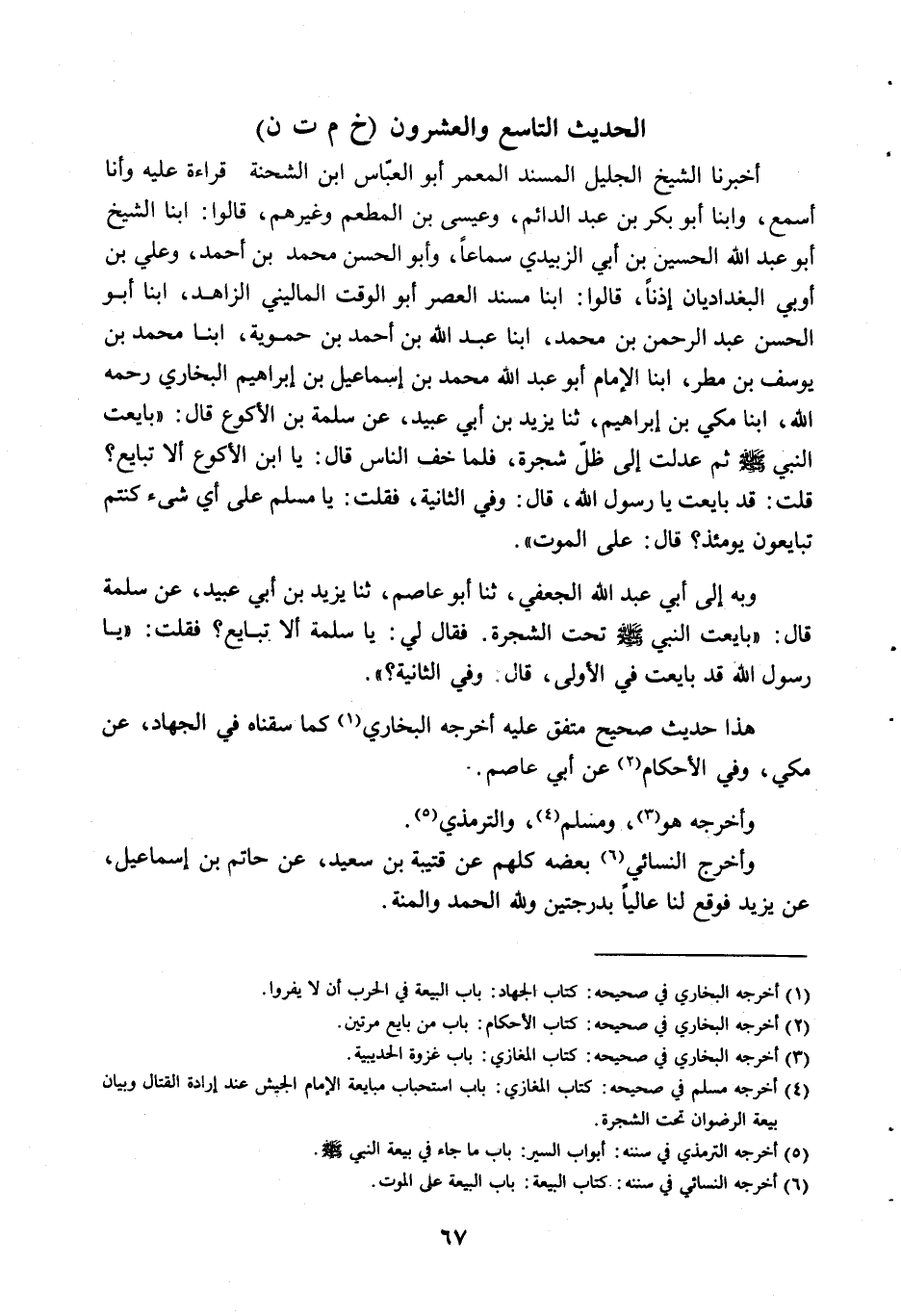 أَخْبَرَنَا الشَّيْخُ الْجَلِيلُ الْمُسْنِدُ الْمُعَمِّرُ أَبُو الْعَبَّاسِ بْنُ الشِّحْنَةِ، قِرَاءَةً عَلَيْهِ، وَأَنَا أَسْمَعُ، وَأنبا أَبُو بَكْرِ بْنُ عَبْدِ الدَّائِمِ، وَعِيسَى بْنُ الْمُطْعِمِ، وَغَيْرُهُمْ، قَالُوا: أنبا الشَّيْخُ أَبُو عَبْدِ اللَّهِ الْحُسَيْنُ بْنُ أَبِي الزُّبَيْدِيِّ، سَمَاعًا، وَأَبُو الْحَسَنِ مُحَمَّدُ بْنُ أَحْمَدَ، وَعَلِيُّ بْنُ أَوْبَى الْبَغْدَادِيَّانِ، إِذْنًا , مُسْنِدُ الْعَصْرِ أَبُو الْوَقْتِ الْمَالِينِيُّ الزَّاهِدُ، أنبا أَبُو الْحَسَنِ عَبْدُ الرَّحْمَنِ بْنُ مُحَمَّدٍ، أنبا عَبْدُ اللَّهِ بْنُ أَحْمَدَ بْنِ حَمَّوَيْهِ، أَنْبَأَ مُحَمَّدُ بْنُ يُوسُفَ بْنِ مَطَرٍ، أنبا الإِمَامُ أَبُو عَبْدِ اللَّهِ مُحَمَّدُ بْنُ إِسْمَاعِيلَ بْنِ إِبْرَاهِيمَ الْبُخَارِيّ، رَحِمَهُ اللَّهُ، أنبا مَكِّيُّ بْنُ إِبْرَاهِيمَ، ثنا يَزِيدُ بْنُ أَبِي عُبَيْدٍ، عَنْ سَلَمَةَ بْنِ الأَكْوَعِ، قَالَ: بَايَعْتُ النَّبِيَّ صَلَّى اللَّهُ عَلَيْهِ وَسَلَّمَ، ثُمَّ عَدَلْتُ إِلَى ظِلِّ شَجَرَةٍ فَلَمَّا خَفَّ النَّاسُ، قَالَ: «يَابْنَ الأَكْوَعِ أَلا تُبَايِعُ؟» .