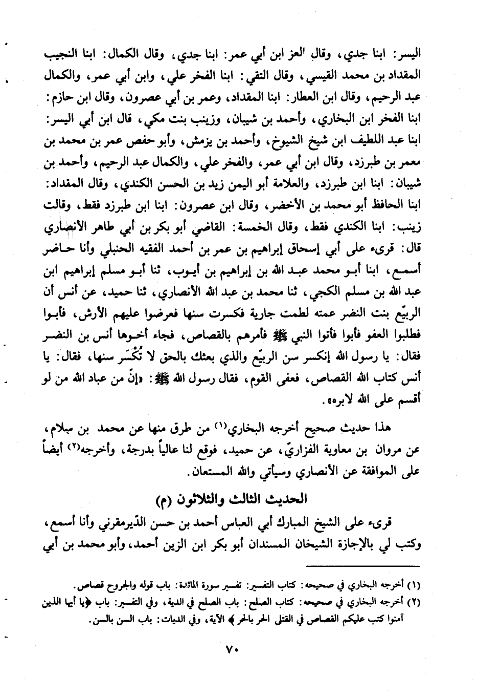 الْيَسَرِ: أنبا جَدِّي، وَقَالَ الْعِزُّ بْنُ أَبِي عُمَرَ: أنبا جَدِّي، وَقَالَ الْكَمَالُ: أنبا النَّجِيبُ بْنُ الْمِقْدَادِ بْنِ مُحَمَّدٍ الْقَيْسِيُّ، وَقَالَ التَّقِيُّ: أنبا الْفَخْرُ عَلِيٌّ، وَابْنُ أَبِي عُمَرَ، وَالْكَمَالُ عَبْدُ الرَّحِيمِ، وَقَالَ ابْنُ الْعَطَّارِ: أنبا الْمِقْدَادُ، وَعُمَرُ بْنُ أَبِي عَصْرُونَ، وَقَالَ ابْنُ حَازِمٍ: أنبا الْفَخْرُ بْنُ الْبُخَارِيِّ، وَأَحْمَدُ بْنُ شَيْبَانَ، وَزَيْنَبُ بِنْتُ مَكِّيٍّ، قَالَ ابْنُ أَبِي الْيَسَرِ: أنبا عَبْدُ اللَّطِيفِ بْنُ شَيْخِ الشُّيُوخِ، وَأَحْمَدُ بْنُ تزمش، وَأَبُو حَفْصٍ عُمَرُ بْنُ مُحَمَّدِ بْنِ مَعْمَرِ بْنِ طَبَرْزُدَ، وَقَالَ ابْنُ أَبِي عُمَرَ، وَالْفَخْرُ عَلِيٌّ، وَالْكَمَالُ عَبْدُ الرَّحِيمِ، وَأَحْمَدُ بْنُ شَيْبَانَ: أنبا ابْنُ طَبَرْزُدَ وَالْعَلامَةُ أَبُو الْيُمْنِ زَيْدُ بْنُ الْحَسَنِ الْكِنْدِيُّ، وَقَالَ الْمِقْدَادُ: أنبا الْحَافِظُ أَبُو مُحَمَّدِ بْنُ الأَخْضَرِ، وَقَالَ ابْنُ عَصْرُونَ: أنبا ابْنُ طَبَرْزُدَ، فَقَطْ، وَقَالَتْ زَيْنَبُ: أنبا الْكِنْدِيُّ فَقَطْ، وَقَالَ الْخَمْسَةُ الْقَاضِي أَبُو بَكْرِ بْنُ أَبِي طَاهِرٍ الأَنْصَارِيُّ، قَالَ: قُرِئَ عَلَى أَبِي إِسْحَاقَ إِبْرَاهِيمَ بْنِ عُمَرَ بْنِ أَحْمَدَ الْفَقِيهِ الْحَنْبَلِيِّ، وَأَنَا حَاضِرٌ أَسْمَعُ، أنبا أَبُو مُحَمَّدٍ عَبْدُ اللَّهِ بْنُ إِبْرَاهِيمَ بْنِ أَيُّوبَ، ثنا أَبُو مُسْلِمٍ إِبْرَاهِيمُ بْنُ عَبْدِ اللَّهِ بْنِ مُسْلِمٍ الْكَجِّيُّ، ثنا مُحَمَّدُ بْنُ عَبْدِ اللَّهِ الأَنْصَارِيُّ، ثنا حُمَيْدٌ، عَنْ أَنَسٍ، أَنَّ الرُّبَيِّعَ بِنْتَ النَّضْرِ عَمَّتَهُ لَطَمَتْ جَارِيَةً فَكَسَرَتْ سِنَّهَا، فَعَرَضُوا عَلَيْهِمُ الأَرْشَ، فَأَبَوْا فَطَلَبُوا الْعَفْوَ، فَأَبَوْا فَأَتَوُا النَّبِيَّ صَلَّى اللَّهُ عَلَيْهِ وَسَلَّمَ فَأَمَرَهُمْ بِالْقِصَاصِ فَجَاءَ أَخُوهَا أَنَسُ بْنُ النَّضْرِ، فَقَالَ: يَا رَسُولَ اللَّهِ أَتُكْسَرُ سِنُّ الرُّبَيِّعِ، وَالَّذِي بَعَثَكَ لا تُكْسَرُ سِنُّهَا، فَقَالَ: «يَا أَنَسُ كِتَابُ اللَّهِ الْقِصَاصُ» .