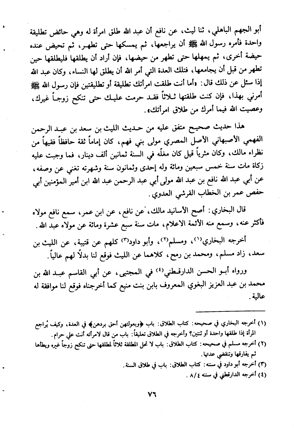 أَبُو الْجَهْمِ الْبَاهِلِيُّ، ثنا لَيْثٌ، عَنْ نَافِعٍ , أَنَّ عَبْدَ اللَّهِ بْنَ عُمَرَ طَلَّقَ امْرَأَةً لَهُ وَهِيَ حَائِضٌ تَطْلِيقَةً وَاحِدَةً، فَأَمَرَهُ رَسُولُ اللَّهِ صَلَّى اللَّهُ عَلَيْهِ وَسَلَّمَ أَنْ يُرَاجِعَهَا، ثُمَّ يُمْسِكَهَا حَتَّى تَطْهُرَ، ثُمَّ تَحِيضَ عِنْدَهُ حَيْضَةً أُخْرَى، ثُمَّ يُمْهِلَهَا، حَتَّى تَطْهُرَ مِنْ حَيْضِهَا , َفَإِنْ أَرَادَ أَنْ يُطَلِّقَهَا فَلْيُطَلِّقْهَا مِنْ قَبْلَ أَنْ يُجَامِعَهَا فَتِلْكَ الْعِدَّةُ الَّتِي أَمَرَ اللَّهُ أَنْ يُطَلَّقَ لَهَا النِّسَاءُ، وَكَانَ عَبْدُ اللَّهِ إِذَا سُئِلَ عَنْ ذَلِكَ، قَالَ: أَمَّا أَنْتَ طَلَّقْتَ امْرَأَتَكَ تَطْلِيقَةً أَوْ تَطْلِيقَتَيْنِ , فَإِنَّ رَسُولَ اللَّهِ صَلَّى اللَّهُ عَلَيْهِ وَسَلَّمَ أَمَرَنِي بِهَذَا فَإِنْ كُنْتَ طَلَّقْتَهَا ثَلاثًا فَقَدْ حَرُمَتْ عَلَيْكَ حَتَّى تَنْكِحَ زَوْجًا غَيْرَكَ، وَعَصَيْتَ اللَّهَ فِيمَا أَمَرَكَ مِنْ طَلاقِ امْرَأَتِكَ ".