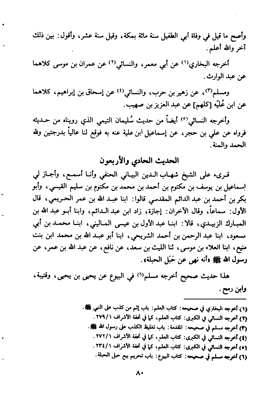 قُرِئَ عَلَى الشَّيْخِ شِهَابِ الدِّينِ الْبَيَانِيِّ الْحَنَفِيِّ، وَأَنَا أَسْمَعُ، وَأَجَازَ لِي إِسْمَاعِيلُ بْنُ يُوسُفَ بْنِ مَكْتُومِ بْنِ أَحْمَدَ بْنِ مُحَمَّدِ بْنِ مَكْتُومِ بْنِ سُلَيْمٍ الْقَيْسِيُّ، وَأَبُو بَكْرِ بْنُ أَحْمَدَ بْنِ عَبْدِ الدَّائِمِ الْمَقْدِسِيُّ، قَالُوا: أنبا عَبْدُ اللَّهِ بْنُ عُمَرَ الْحَرِيمِيُّ، قَالَ الأَوَّلُ: سَمِعْنَا، وَقَالَ الآخَرَانِ: إِجَازَةً، زَادَ ابْنُ عَبْدِ الدَّائِمِ، وَأنبا أَبُو عَبْدِ اللَّهِ بْنُ الْمُبَارَكِ الزُّبَيْدِيُّ، قَالا: أنبا عَبْدُ الأَوَّلِ بْنُ عِيسَى الْمَالِينِيُّ، أنبا مُحَمَّدُ بْنُ أَبِي مَسْعُودٍ، أنبا عَبْدُ الرَّحْمَنِ بْنُ أَحْمَدَ الشُّرَيْحِيُّ، أنبا أَبُو عَبْدِ اللَّهِ بْنُ مُحَمَّدِ بْنِ بِنْتِ مَنِيعٍ، أنبا الْعَلاءُ بْنُ مُوسَى، ثنا اللَّيْثُ بْنُ سَعْدٍ، عَنْ نَافِعٍ، عَنْ عَبْدِ اللَّهِ بْنِ عُمَرَ، عَنْ رَسُولِ اللَّهِ صَلَّى اللَّهُ عَلَيْهِ وَسَلَّمَ أَنَّهُ نَهَى عَنْ حَبَلِ الْحَبَلَةِ ".
