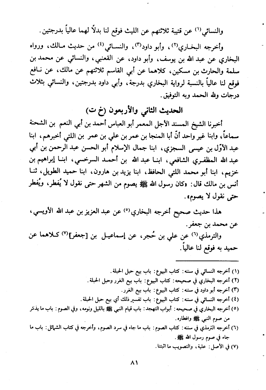 أَخْبَرَنَا الشَّيْخُ الْمُسْنِدُ الأَجَلُّ الْمُعَمِّرُ أَبُو الْعَبَّاسِ أَحْمَدُ بْنُ أَبِي النّعمِ بْنِ الشِّحْنَةِ، سماعا، وَأنبا غَيْرُ وَاحِدٍ، أَنَّ أَبَا الْمُنَجَّا بْنَ عُمَرَ بْنِ عَلِيِّ بْنِ عُمَرَ بْنِ اللَّتِّيِّ، أَخْبَرَهُمْ، أنبا عَبْدُ الأَوَّلِ بْنُ عِيسَى السِّجْزِيُّ، أنبا جَمَالُ الإِسْلامِ أَبُو الْحَسَنِ عَبْدُ الرَّحْمَنِ بْنُ أَبِي عَبْدِ اللَّهِ الْمُظَفَّرِيُّ الشَّافِعِيُّ، أنبا عَبْدُ اللَّهِ بْنُ أَحْمَدَ السَّرَخْسِيُّ، أنبا إِبْرَاهِيمُ بْنُ خُزَيْمٍ، أنبا أَبُو مُحَمَّدٍ الكشي الْحَافِظُ، أنبا يَزِيدُ بْنُ هَارُونَ، أنبا حُمَيْدٌ الطَّوِيلُ، ثنا أَنَسُ بْنُ مَالِكٍ , قَالَ: كَانَ رَسُولُ اللَّهِ صَلَّى اللَّهُ عَلَيْهِ وَسَلَّمَ «يَصُومُ مِنَ الشَّهْرِ حَتَّى نَقُولَ لا يُفْطِرُ، وَيُفْطِرُ حَتَّى نَقُولَ لا يَصُومُ» .