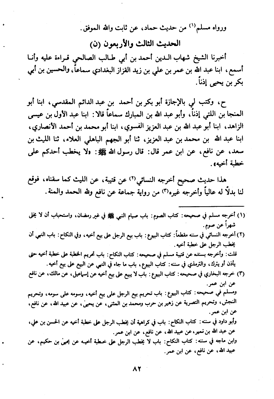 ح، وَكَتَبَ لِي بِالإِجَازَةِ أَبُو بَكْرِ بْنُ أَحْمَدَ بْنِ عَبْدِ الدَّائِمِ الْمَقْدِسِيُّ، أنبا أَبُو الْمُنَجَّا بْنُ اللَّتِّيِّ، إِذْنًا , وَأَبُو عَبْدِ اللَّهِ بْنُ الْمُبَارَكِ سَمَاعًا، قَالا: أنبا عَبْدُ الأَوَّلِ بْنُ عِيسَى الزَّاهِدُ، أَنْبَأَ أَبُو عَبْدِ اللَّهِ بْنُ عَبْدِ الْعَزِيزِ الْفَسَوِيُّ، أنبا أَبُو مُحَمَّدِ بْنُ أَحْمَدَ الأَنْصَارِيُّ، أنبا عَبْدُ اللَّهِ بْنُ مُحَمَّدِ بْنِ عَبْدِ الْعَزِيزِ، ثنا أَبُو الْجَهْمِ الْبَاهِلِيُّ الْعَلاءُ، ثنا اللَّيْثُ بْنُ سَعْدٍ، عَنْ نَافِعٍ، عَنِ ابْنِ عُمَرَ، قَالَ: قَالَ رَسُولُ اللَّهِ صَلَّى اللَّهُ عَلَيْهِ وَسَلَّمَ: «لا يَخْطُبُ أَحَدُكُمْ عَلَى خِطْبَةِ أَخِيهِ» .