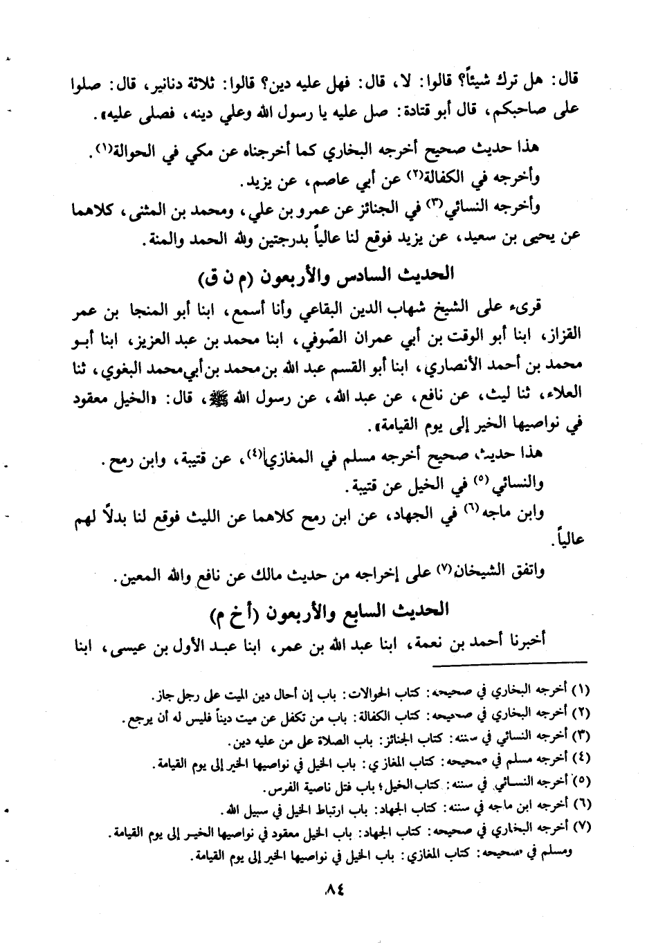 قُرِئَ عَلَى الشَّيْخِ شِهَابِ الدِّينِ الْبقَاعِيِّ , وَأَنَا أَسْمَعُ، أَنْبَأَ أَبُو الْمُنَجَّا بْنُ عَمْرٍو الْقَزَّازُ، أَنْبَأَ أَبُو الْوَقْتِ بْنُ أَبِي عِمْرَانَ الصُّوفِيُّ، أَنْبَأَ مُحَمَّدُ بْنُ عَبْدِ الْعَزِيزِ، أَنْبََأَ أَبُو مُحَمَّدِ بْنُ أَحْمَدَ الأَنْصَارِيُّ، أَنْبَأَ أَبُو الْقَاسِمِ عَبْدُ اللَّهِ بْنُ مُحَمَّدِ بْنِ أَبِي مُحَمَّدٍ الْبَغَوِيُّ، ثنا الْعَلاءُ، عَنِ اللَّيْثِ، عَنْ نَافِعٍ، عَنْ عَبْدِ اللَّهِ، عَنْ رَسُولِ اللَّهِ صَلَّى اللَّهُ عَلَيْهِ وَسَلَّمَ قَالَ: «الْخَيْلُ مَعْقُودٌ فِي نَوَاصِيهَا الْخَيْرُ إِلَى يَوْمِ الْقِيَامَةِ» .