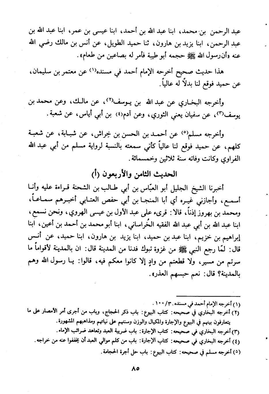 هَذَا حَدِيثٌ صَحِيحٌ أَخْرَجَهُ الإِمَامُ أَحْمَدُ فِي مُسْنَدِهِ , عَنْ مُعْتَمِرِ بْنِ سُلَيْمَانَ، عَنْ حُمَيْدٍ , فَوَقَعَ لَنَا بَدَلا لَهُ عَالِيًا، وَأَخْرَجَهُ الْبُخَارِيُّ عَنْ عَبْدِ اللَّهِ بْنِ يُوسُفَ، عَنْ مَالِكٍ، وَعَنْ مُحَمَّدِ بْنِ يُوسُفَ، عَنْ سُفْيَانَ , يَعْنِي الثَّوْرِيَّ، وَعَنْ آدَمَ بْنِ أَبِي إِيَاسٍ، عَنْ شُعْبَةَ، وَأَخْرَجَهُ مُسْلِمٌ، عَنْ أَحْمَدَ بْنِ الْحَسَنِ بْنِ خِرَاشٍ، عَنْ شَبَابَةَ، عَنْ شُعْبَةَ، كُلُّهُمْ عَنْ حُمَيْدٍ , فَوَقَعَ لَنَا عَالِيًا , كَأَنِّي سَمِعْتُهُ بِالنِّسْبَةِ لِرِوَايَةِ مُسْلِمِ بْنِ أَبِي عَبْدِ اللَّهِ الْفُرَاوِيِّ , وَكَانَتْ وَفَاتُهُ سَنَةَ ثَلاثِينَ وَخَمْسِ مِائَةٍ