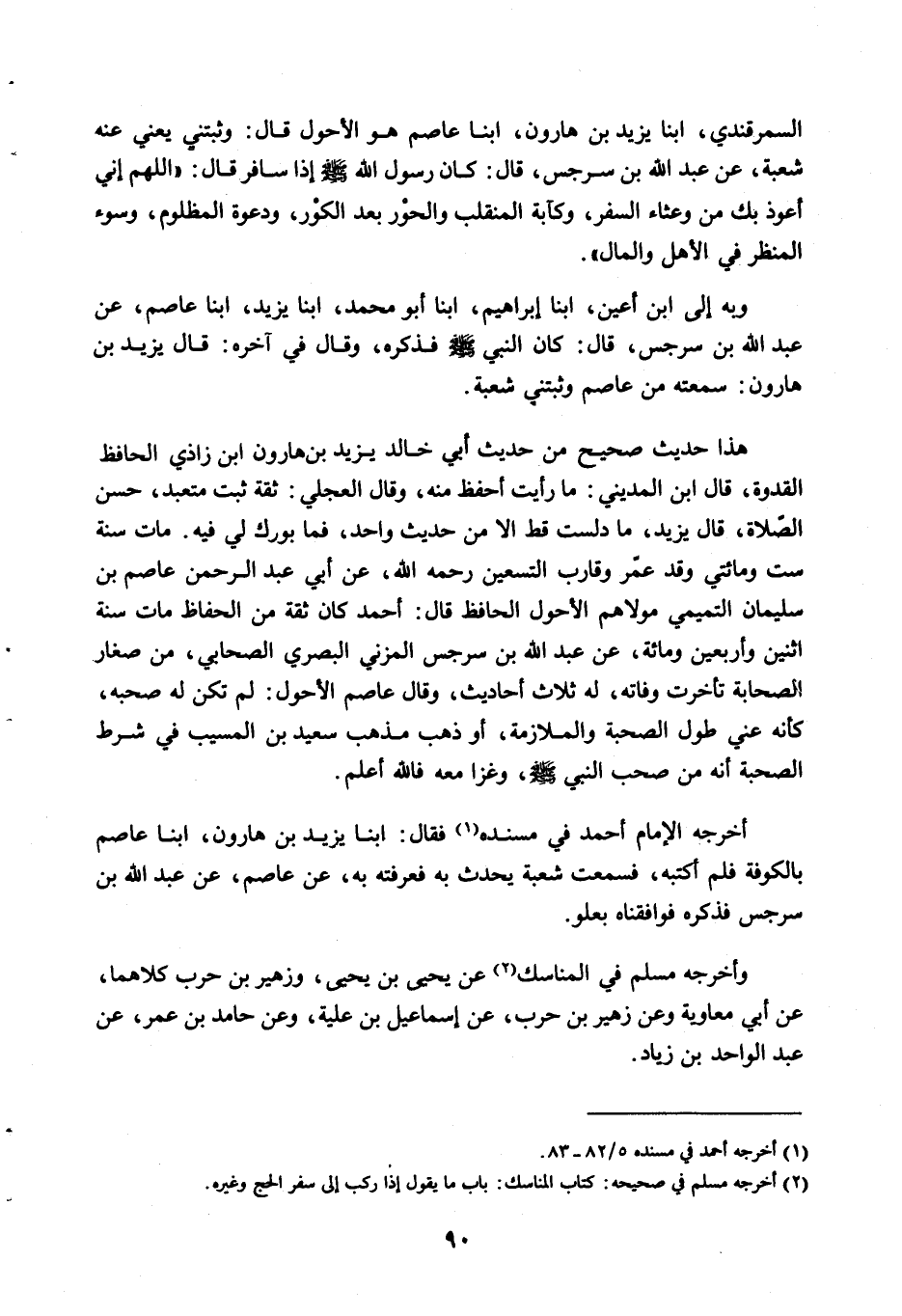 السَّمَرْقَنْدِيُّ، أنبا يَزِيدُ بْنُ هَارُونَ، أنبا عَاصِمٌ هُوَ الأَحْوَلُ، قَالَ: وَثَبَّتَنِي يَعْنِي عَنْهُ شُعْبَةُ، عَنْ عَبْدِ اللَّهِ بْنِ سَرْجِسَ، قَالَ: كَانَ رَسُولُ اللَّهِ صَلَّى اللَّهُ عَلَيْهِ وَسَلَّمَ إِذَا سَافَرَ، قَالَ: «اللَّهُمَّ إِنِّي أَعُوذُ بِكَ مِنْ وَعْثَاءِ السَّفَرِ، وَكَآبَةِ الْمُنْقَلَبِ، وَالْحَوَرِ بَعْدَ الْكَوَرِ، وَدَعْوَةِ الْمَظْلُومِ، وَسُوءِ الْمَنْظَرِ فِي الأَهْلِ وَالْمَالِ» .