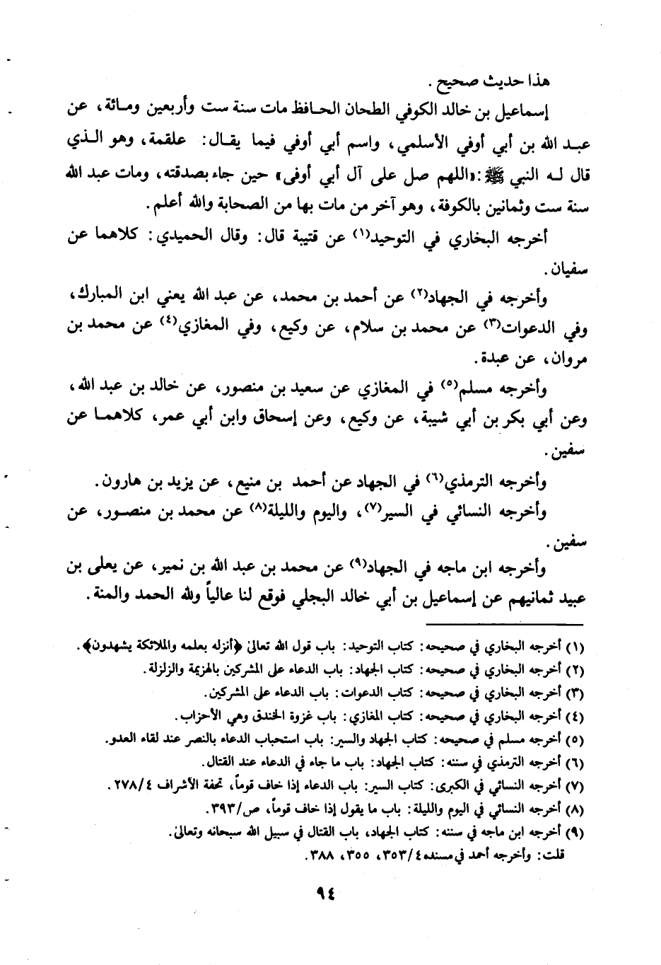 أَخْرَجَهُ الْبُخَارِيُّ فِي التَّوْحِيدِ، عَنْ قُتَيْبَةَ، قَالَ: وَقَالَ الْحُمَيْدِيُّ: كِلاهُمَا عَنْ سُفْيَانَ، وَأَخْرَجَهُ فِي الْجِهَادِ، عَنْ أَحْمَدَ بْنِ مُحَمَّدٍ، عَنْ عَبْدِ اللَّهِ، يَعْنِي ابْنَ الْمُبَارَكِ، وَفِي الدَّعَوَاتِ عَنْ مُحَمَّدِ بْنِ سَلامٍ، عَنْ وَكِيعٍ، وَفِي الْمَغَازِي، عَنْ مُحَمَّدِ بْنِ مَرْوَانَ، عَنْ عَبْدَةَ، وَأَخْرَجَهُ مُسْلِمٌ فِي الْمَغَازِي، عَنْ سَعِيدِ بْنِ مَنْصُورٍ، عَنْ خَالِدِ بْنِ عَبْدِ اللَّهِ، وَعَنْ أَبِي بَكْرِ بْنِ أَبِي شَيْبَةَ، عَنْ وَكِيعٍ، وَعَنْ إِسْحَاقَ، وَابْنِ أَبِي عُمَرَ كِلاهُمَا، عَنْ سُفْيَانَ، وَأَخْرَجَهُ التِّرْمِذِيُّ، فِي الْجِهَادِ، عَنْ أَحْمَدَ بْنِ مَنِيعٍ، عَنْ يَزِيدَ بْنِ هَارُونَ، وَأَخْرَجَهُ النَّسَائِيُّ فِي السِّيَرِ، وَالْيَوْمِ وَاللَّيْلَةِ، عَنْ مُحَمَّدِ بْنِ مَنْصُورٍ، عَنْ سُفْيَانَ، وَأَخْرَجَهُ ابْنُ مَاجَهْ فِي الْجِهَادِ، عَنْ مُحَمَّدِ بْنِ عَبْدِ اللَّهِ بْنِ نُمَيْرٍ، عَنْ يَعْلَى بْنِ عُبَيْدٍ، ثَمَانِيتُهُمْ، عَنْ إِسْمَاعِيلَ بْنِ أَبِي خَالِدٍ الْبَجَلِيِّ فَوَقَعَ لَنَا عَالِيًا وَلِلَّهِ الْحَمْدُ وَالْمِنَّةُ