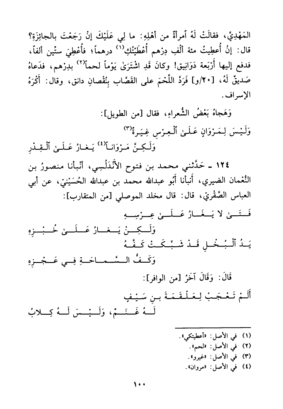 124 - حدثني مُحَمَّد بْن فتوح الأندلسي، أنبأنا منصور بْن النعمان الضيري، أنبأنا أبو عبد اللَّه مُحَمَّد بْن عبد اللَّه الحسيني، عن أبي العباس الصقري، قَالَ: قَالَ مخلد الموصلي من المتقارب: