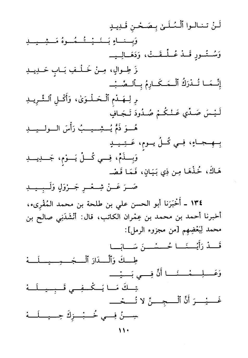 134 - أخبرنا أبو الحسن علي بْن طلحة بْن مُحَمَّد المقرئ، أخبرنا أَحْمَد بْن مُحَمَّد بْن عمران الكاتب، قَالَ: أنشدني صالح بْن مُحَمَّد لبعضهم من مجزوء الرمل: «