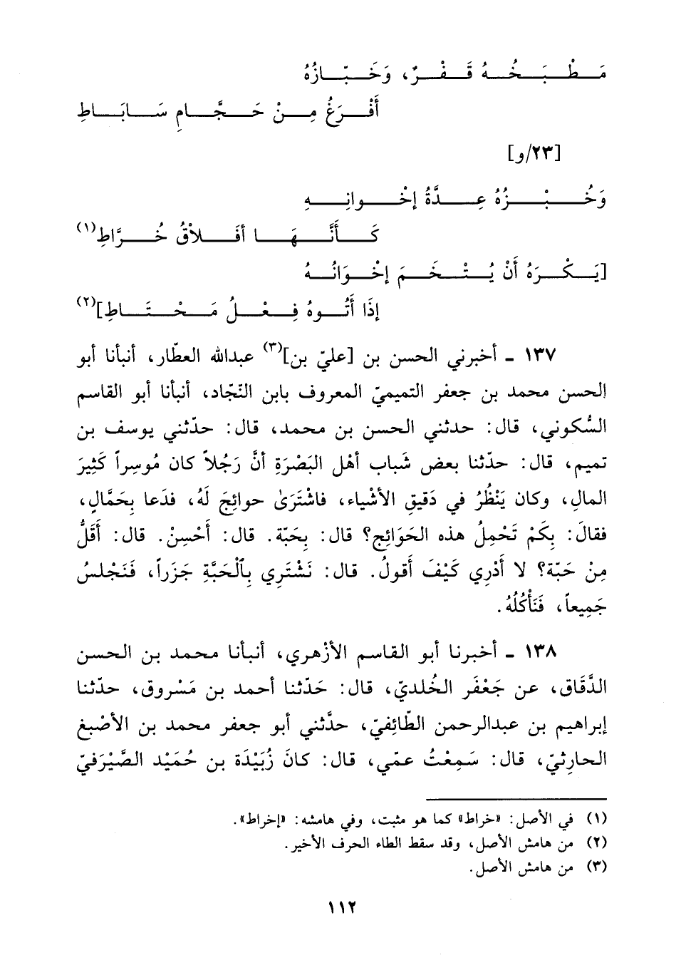 138 - أخبرنا أبو القاسم الأزهري، أنبأنا مُحَمَّد بْن الحسن الدقاق، عن جعفر الخلدي، قَالَ: حَدَّثَنَا أَحْمَد بْن مسروق، حَدَّثَنَا إبراهيم بْن عبد الرحمن الطائفي، حدثني أبو جعفر مُحَمَّد بْن الأصبغ الحارثي، قَالَ: سمعت عمي، قَالَ: " كان زبيدة بْن حميد الصيرفي