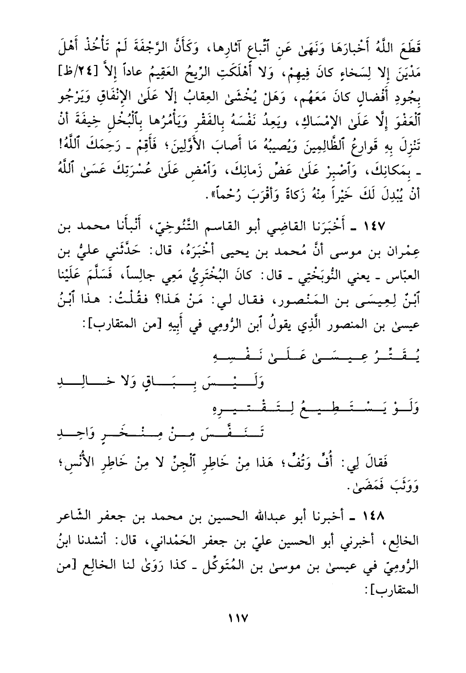 147 - أخبرنا القاضي أبو القاسم التنوخي، أنبأنا مُحَمَّد بْن عمران بْن موسى، أنّ مُحَمَّد بْن يحيى أخبره، قَالَ: حدثني علي بْن العباس يعني: النوبختي، قَالَ: " كان البختري معي جالسا، فسلم علينا ابن لعيسى بْن المنصور، فقال لي: من هذا؟ فقلت: هذا ابن عيسى بْن المنصور، الذي يقول ابن الرومي في أبيه، من المتقارب: