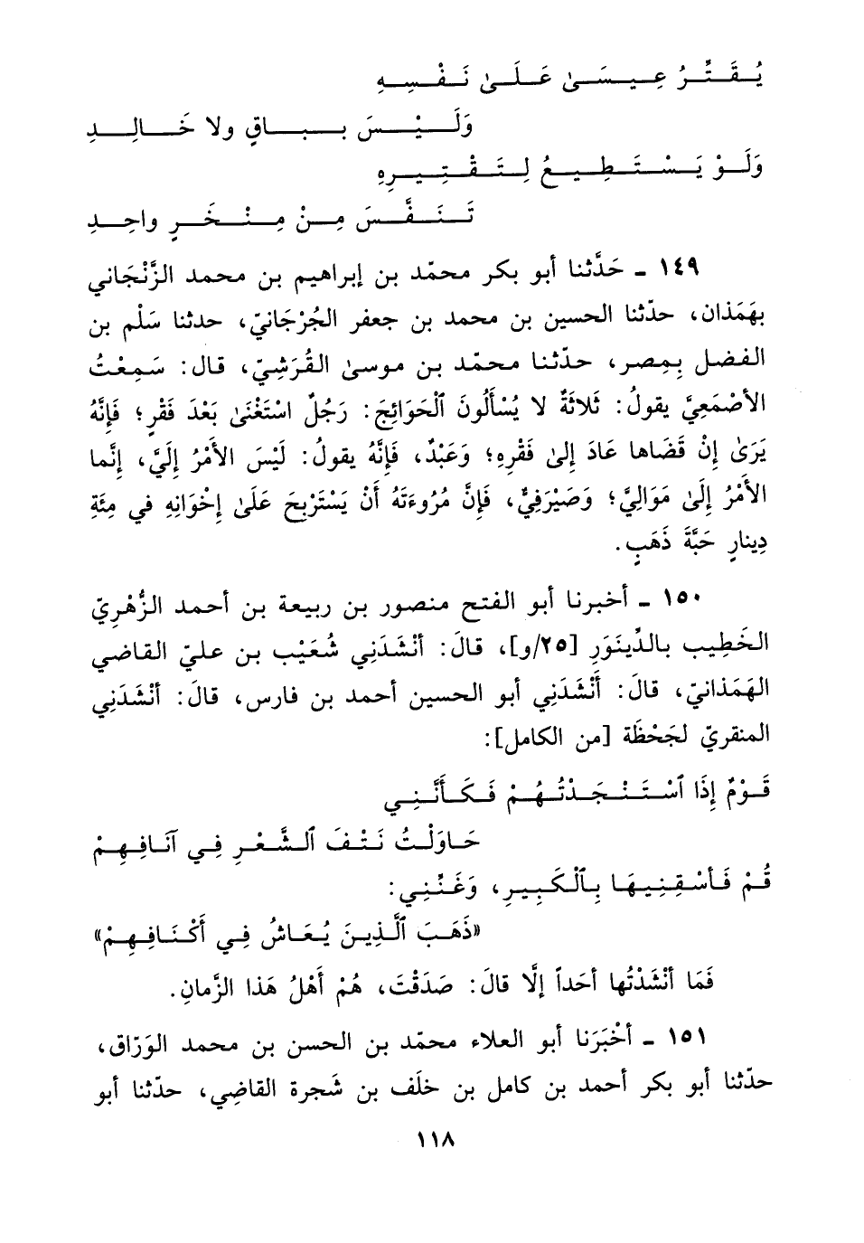 150 - أخبرنا أبو الفتح منصور بْن ربيعة بْن أَحْمَد الزهري الخطيب بالدينور، قَالَ: أنشدني شعيب بْن علي القاضي الهمذاني، قَالَ: أنشدني أبو الحسين أَحْمَد بْن فارس، قَالَ: أنشدني المنقري لجحظة، من الكامل: «