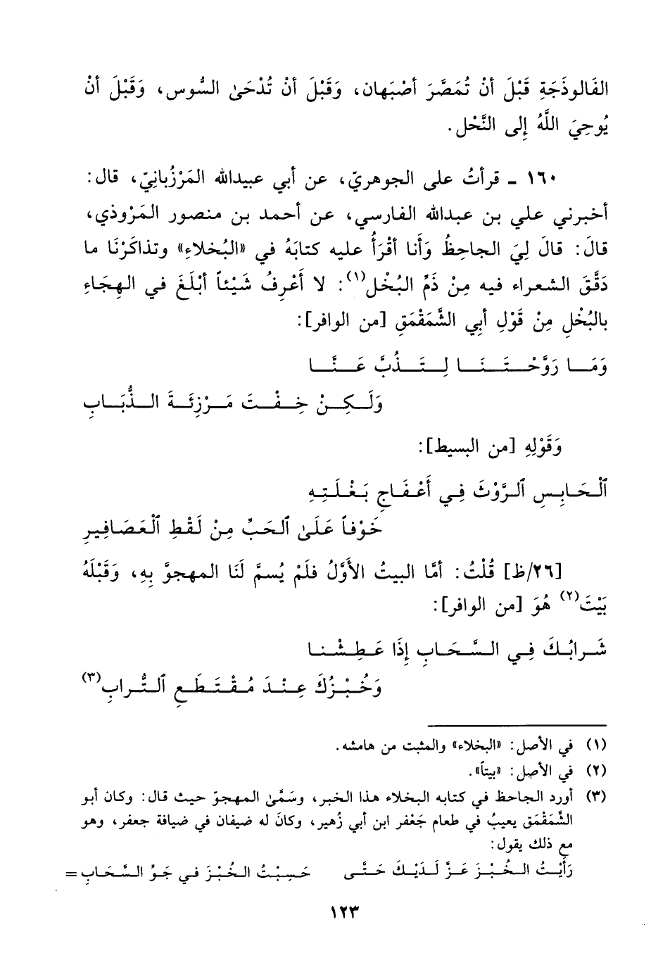 160 - قرأت على الجوهري، عن أبي عبيد اللَّه المرزباني، قَالَ: أخبرني علي بْن عبد اللَّه الفارسي، عن أَحْمَد بْن منصور المروذي، قَالَ: قَالَ لي الجاحظ وأنا أقرأ عليه كتابه في البخلاء، وتذاكرنا ما دقق الشعراء فيه من ذم البخل لا أعرف شيئا أبلغ في الهجاء بالبخل من قول أبي الشمقمق، من الدافر: "