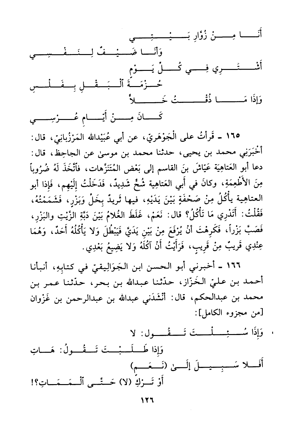 165 - قرأت على الجوهري، عن أبي عبيد اللَّه المرزباني، قَالَ: أخبرني مُحَمَّد بْن يحيى، حَدَّثَنَا مُحَمَّد بْن موسى، عن الجاحظ، قَالَ: " دعا أبو العتاهية عياش بْن القاسم إلى بعض المتنزهات، فاتخذ له ضروبا من الأطعمة، وكان في أبي العتاهية شح شديد، فدخلت إليهم، فإذا أبو العتاهية يأكل من صحفة بين يديه فيها ثريد بخل وبزر، فشممته، فقلت: أتدري ما تأكل؟ قَالَ: نعم، غلط الغلام بين دبة الزيت والبزر، فصب بزرا، فكرهت أن يرفع بين يدي فيبطل ولا يأكله أحد، وهما عندي قريب من قريب، فرأيت أن آكله ولا يضيع بعدي "