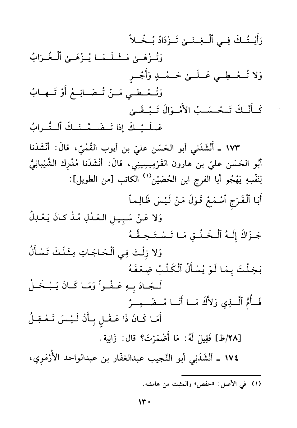173 - أنشدني أبو الحسن علي بْن أيوب القمي، قَالَ: أنشدنا أبو الحسن علي بْن هارون القرميسيني، قَالَ: أنشدنا مدرك الشيباني لنفسه يهجو أبا الفرج بْن الحصين الكاتب، من الطويل: