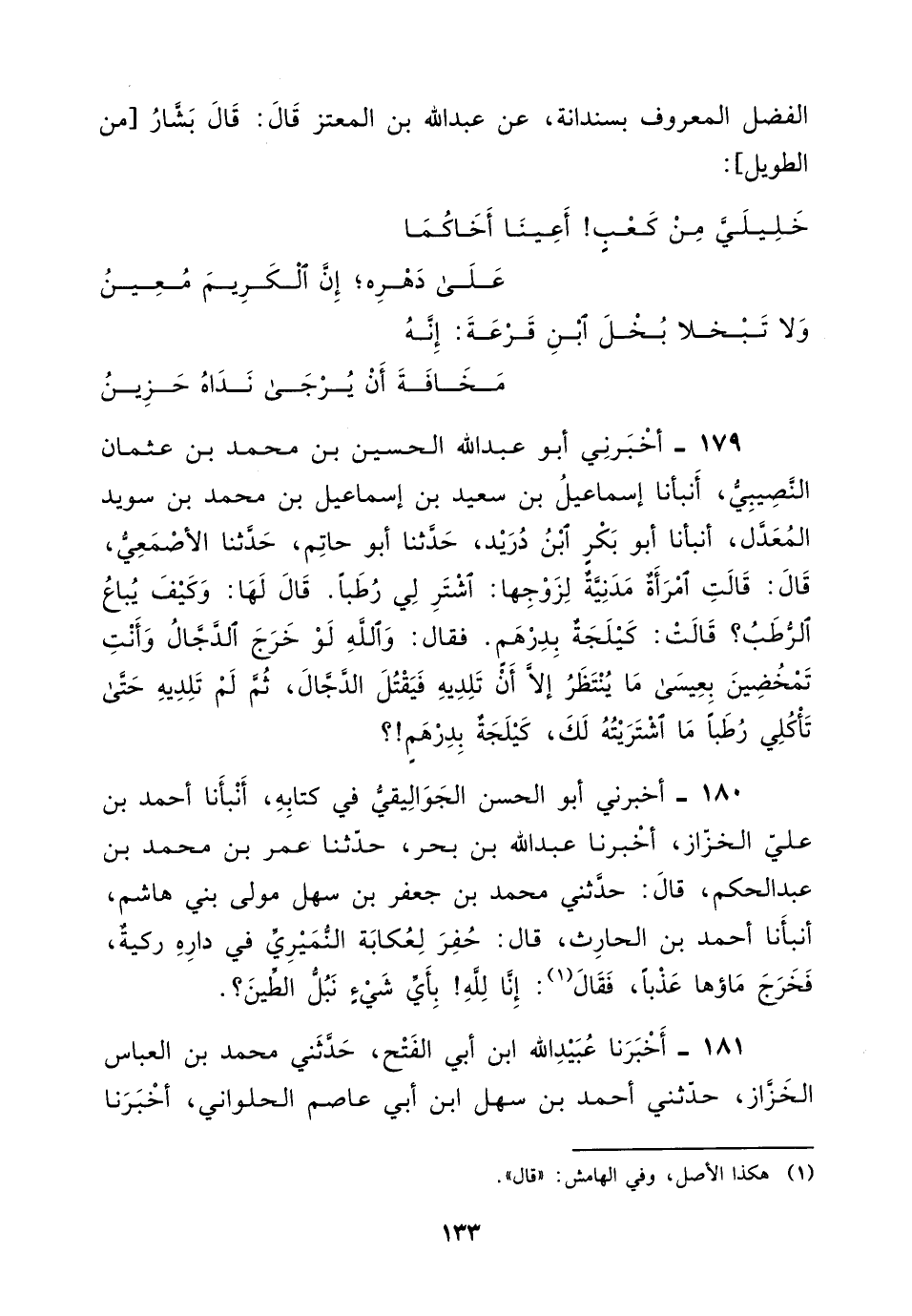 180 - أخبرني أبو الحسن الجواليقي في كتابه، أنبأنا أَحْمَد بْن علي الخزاز، أخبرنا عبد اللَّه بْن بحر، حَدَّثَنَا عمر بْن مُحَمَّد بْن عبد الحكم، قَالَ: حدثني مُحَمَّد بْن جعفر بْن سهل مولى بني هاشم، أنبأنا أَحْمَد بْن الحارث، قَالَ: " حفر لعكابة النميري في داره ركية، فخرج ماؤها عذبا، فقال: إنا لله، بأي شيء نبل الطين؟ "