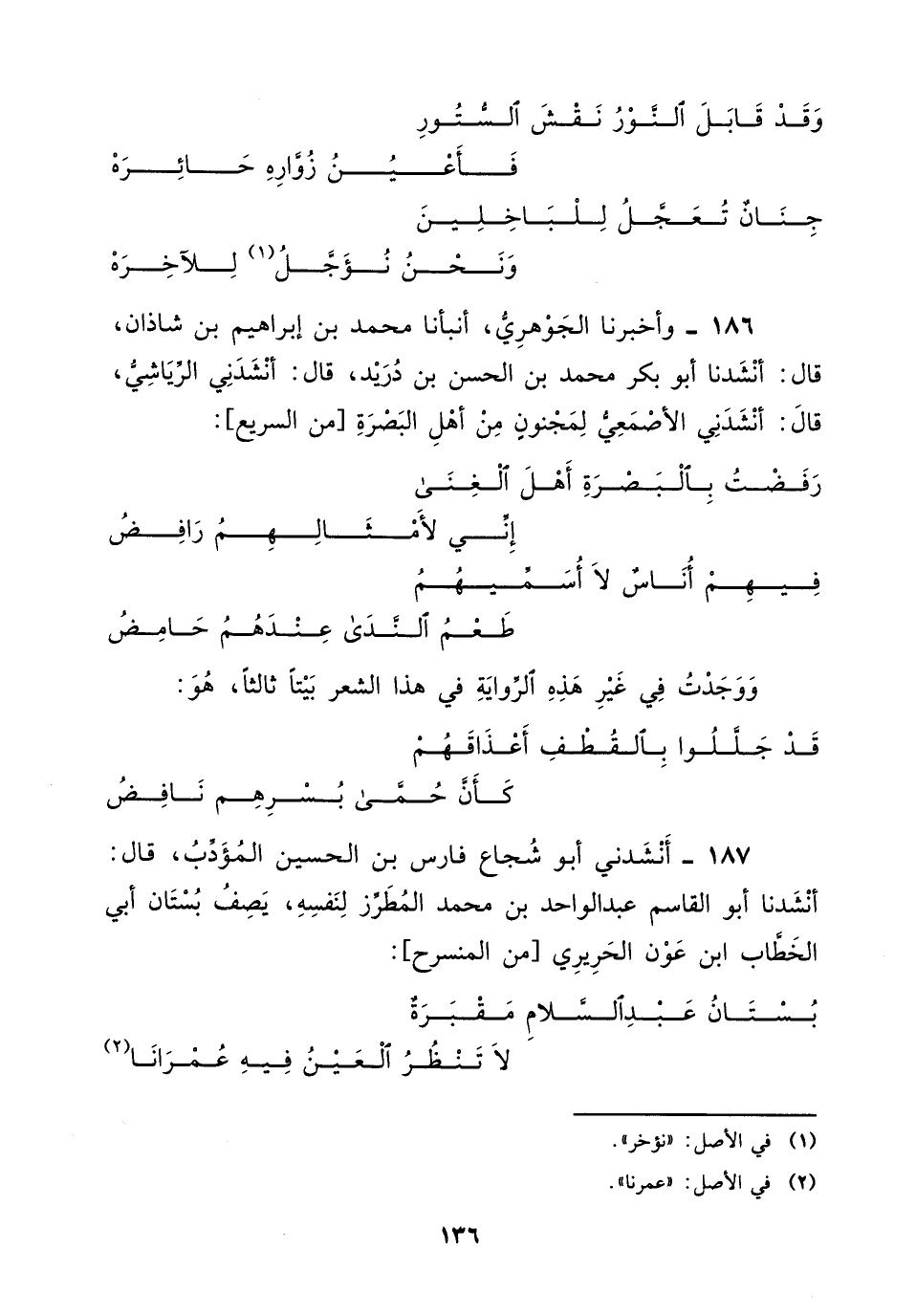 186 - وأخبرنا الجوهري، أنبأنا مُحَمَّد بْن إبراهيم بْن شاذان، قَالَ: أنشدنا أبو بكر مُحَمَّد بْن الحسن بْن دريد، قَالَ: أنشدني الرياشي، قَالَ: أنشدني الأصمعي لمجنون من أهل البصرة، من السريع: «