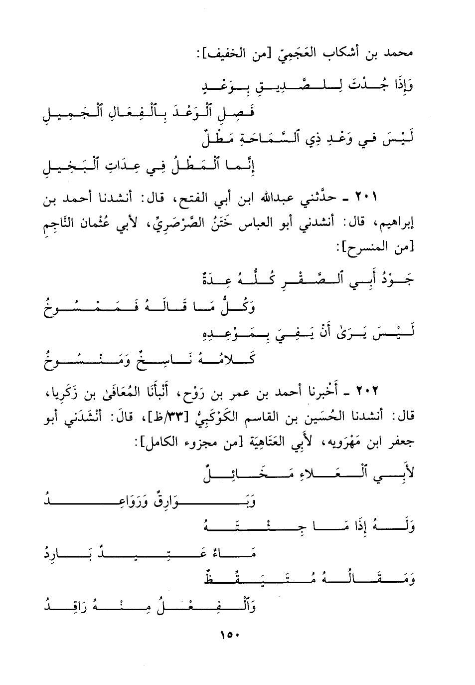 202 - أخبرنا أَحْمَد بْن عمر بْن روح، أنبأنا المعافى بْن زكريا، قَالَ: أنشدنا الحسين بْن القاسم الكوكبي، قَالَ: أنشدني أبو جعفر بْن مهروية، لأبي العتاهية، من مجزوء الكامل: