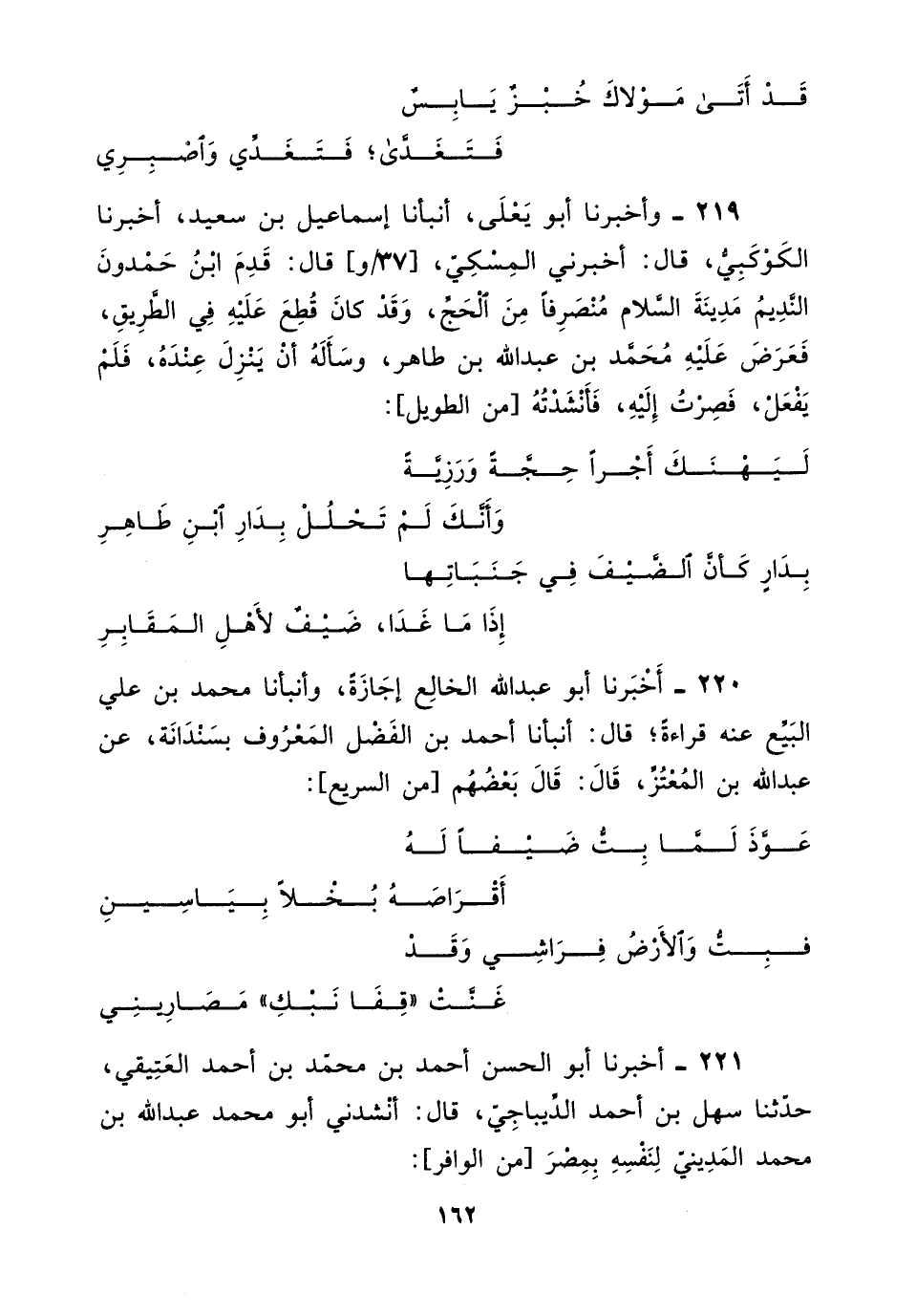 220 - أخبرنا أبو عبد اللَّه الخالع، إجازة، وأنبأنا مُحَمَّد بْن علي البيع عنه، قراءة، قَالَ، أنبأنا أَحْمَد بْن الفضل المعروف بسندانة، عن عبد اللَّه بْن المعتز، قَالَ: قَالَ بعضهم، من السريع: