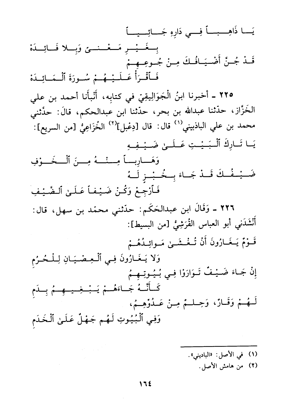 225 - أخبرنا ابن الجواليقي في كتابه، أنبأنا أَحْمَد بْن علي الخزاز، حَدَّثَنَا عبد اللَّه بْن بحر، حَدَّثَنَا ابن عبد الحكم، قَالَ: حدثني مُحَمَّد بْن علي الباذبيني، قَالَ: قَالَ دعبل الخزاعي، من السريع: