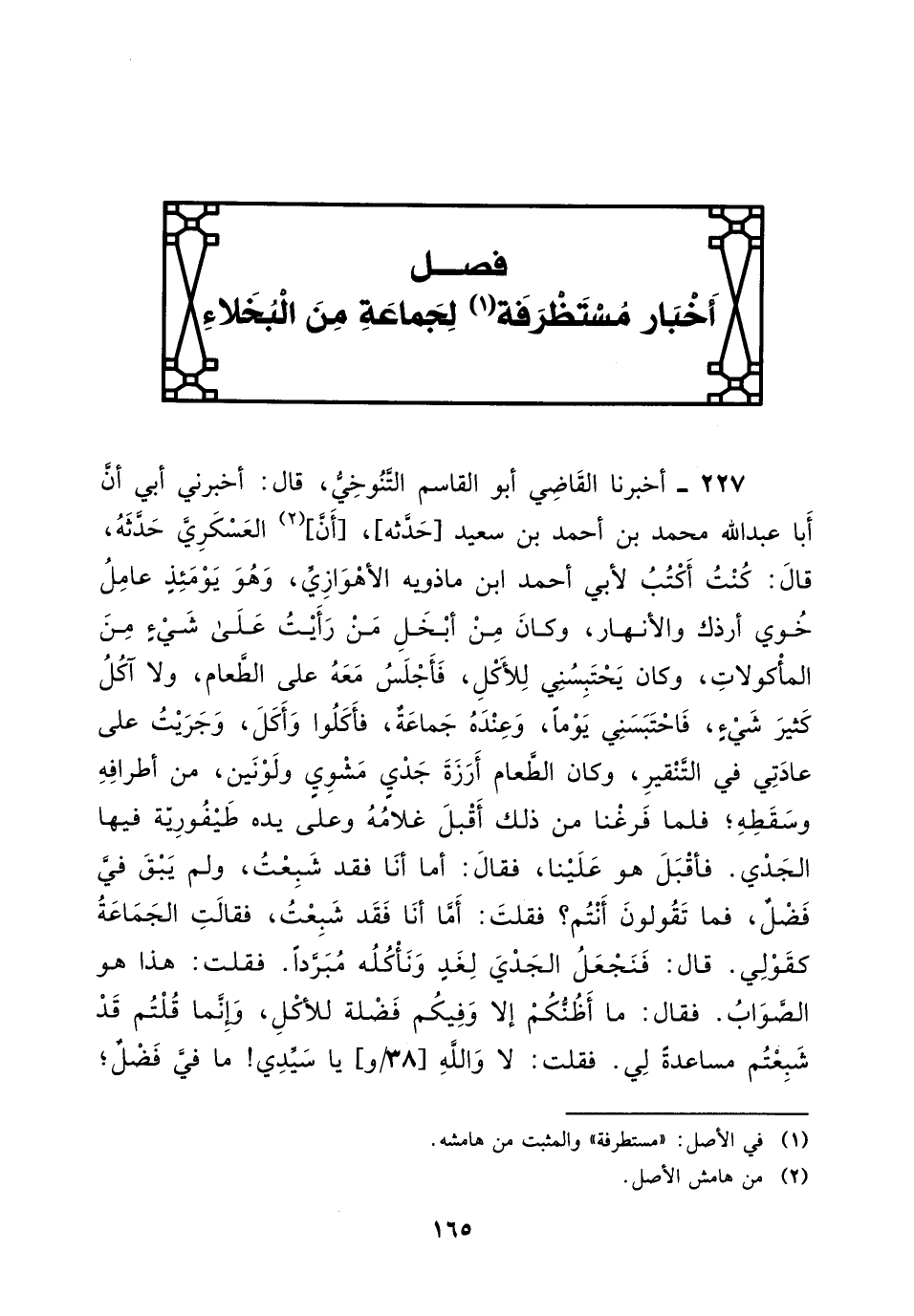 227 - أخبرنا القاضي أبو القاسم التنوخي، قَالَ: أخبرني أبي، أن أبا عبد اللَّه بْن أَحْمَد بْن سعيد حدثه، أن العسكري حدثه، قَالَ: " كنت أكتب لأبي أَحْمَد بْن ماذويه الأهوازي، وهو يومئذ عامل خوي أرذك والأنهار، وكان من أبخل من رأيت على شيء من المأكولات، وكان يحتبسني للأكل، فأجلس معه على الطعام، ولا آكل كثير شيء، فاحتبسني يوما وعنده جماعة، فأكلوا وأكل، وجريت على عادتي في التنقير، وكان الطعام أرزة جدي مشوي ولونين، من أطرافه وسقطه، فلما فرغنا من ذلك أقبل غلامه وعلى يده طيفورية فيها الجدي، فأقبل هو علينا، فقال: أما أنا فقد شبعت، ولم يبق في فضل، فما تقولون أنتم؟ فقلت: أما أنا فقد شبعت.