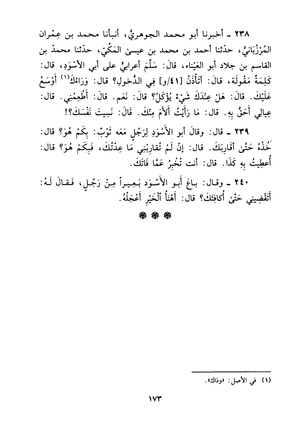 238 - أخبرنا أبو مُحَمَّد الجوهري، أنبأنا مُحَمَّد بْن عمران المرزباني، حدثنا أَحْمَد بْن مُحَمَّد بْن عيسى المكي، حَدَّثَنَا مُحَمَّد بْن القاسم بْن جلاد أبو العيناء، قَالَ: " سلم أعرابي على أبي الأسود، قَالَ: كلمة مقولة، قَالَ: أتأذن في الدخول؟ قَالَ: وراءك أوسع عليك.