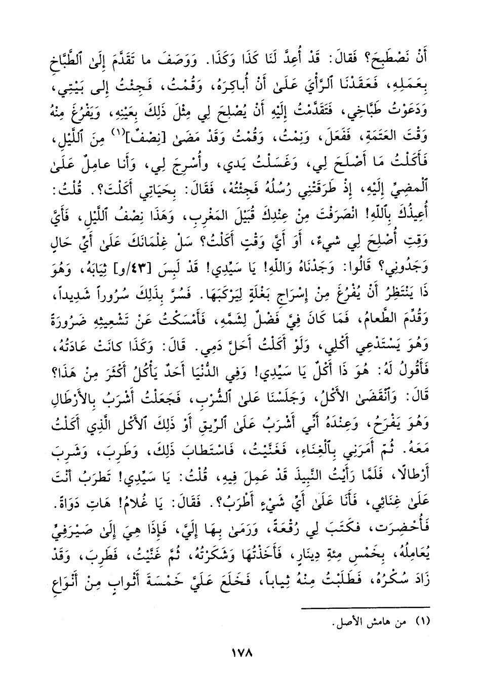 ووصف ما تقدم إلى الطباخ بعمله، فعقدنا الرأي على أن أباكره، وقمت، فجئت إلى بيتي ودعوت طباخي، فتقدمت إليه أن يصلح لي مثل ذلك بعينه، ويفرغ منه وقت العتمة، ففعل ونمت، وقمت وقد مضى نصف من الليل، فأكلت ما أصلح لي، وغسلت يدي، وأسرج لي، وأنا عامل على المضي إليه، إذ طرقتني رسله فجئته، فقال: بحياتي أكلت قلت: أعيذك باللَّه، انصرفت من عندك قبيل المغرب، وهذا نصف الليل، فأي وقت أصلح لي شيء، أو أي وقت أكلت؟ سل غلمانك على أي حال وجدوني؟ قالوا: وجدناه واللَّه يا سيدي، قد لبس ثيابه، وهو ذا ينتظر أن يفرغ من إسراج بغلة ليركبها.