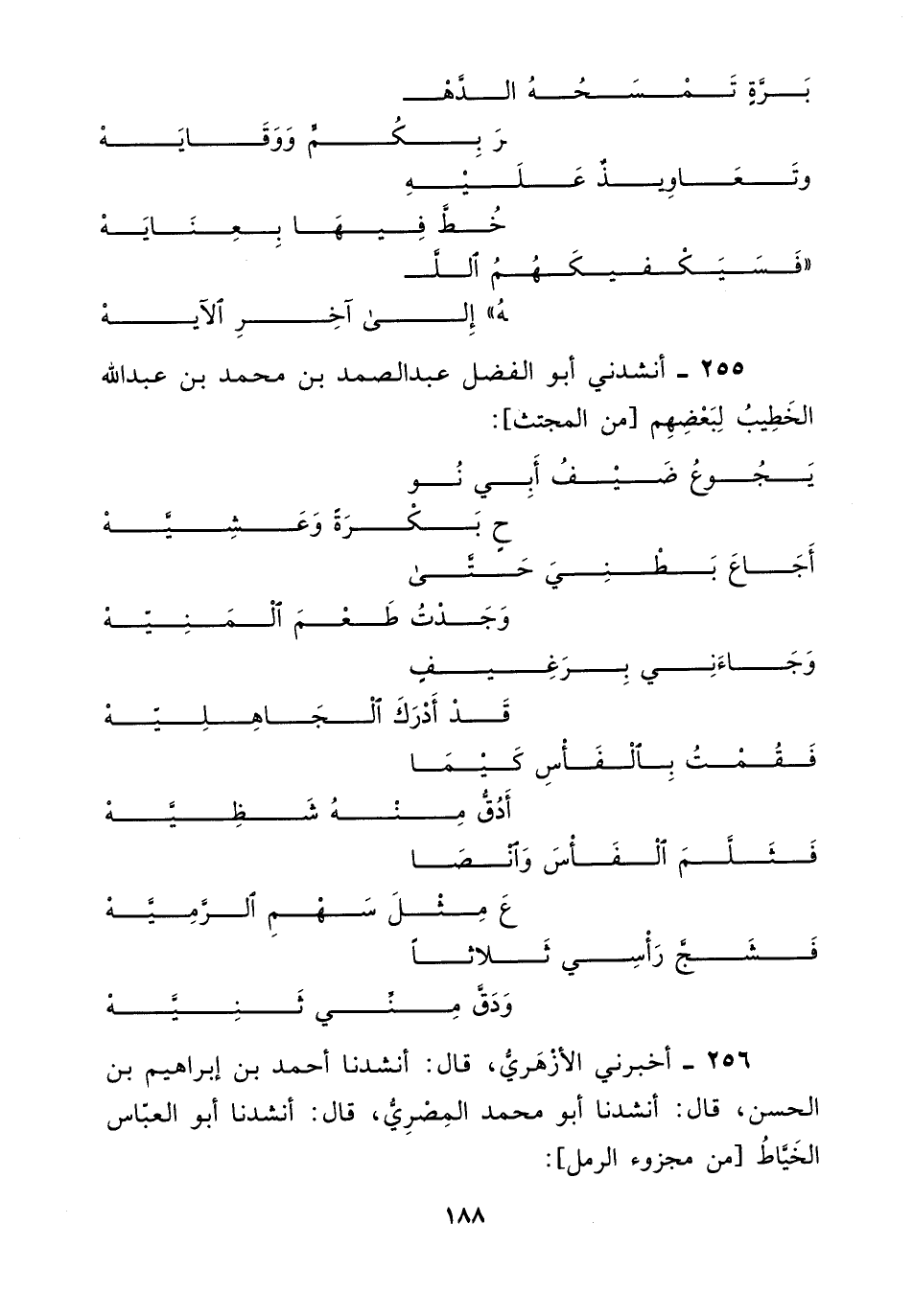 256 - أخبرني الأزهري، قَالَ: أنشدنا أَحْمَد بْن إبراهيم بْن الحسن، قَالَ: أنشدنا أبو مُحَمَّد المصري، قَالَ: أنشدنا أبو العباس الخياط، من مجزوء الرمل: