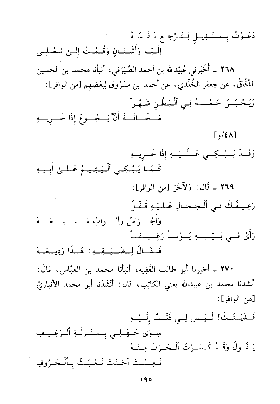 270 - أخبرنا أبو طالب الفقيه، أنبأنا مُحَمَّد بْن العباس، قَالَ: أنشدنا مُحَمَّد بْن عبيد اللَّه يعني: الكاتب، قَالَ: أنشدنا أبو مُحَمَّد الأنباري، من الوافر: