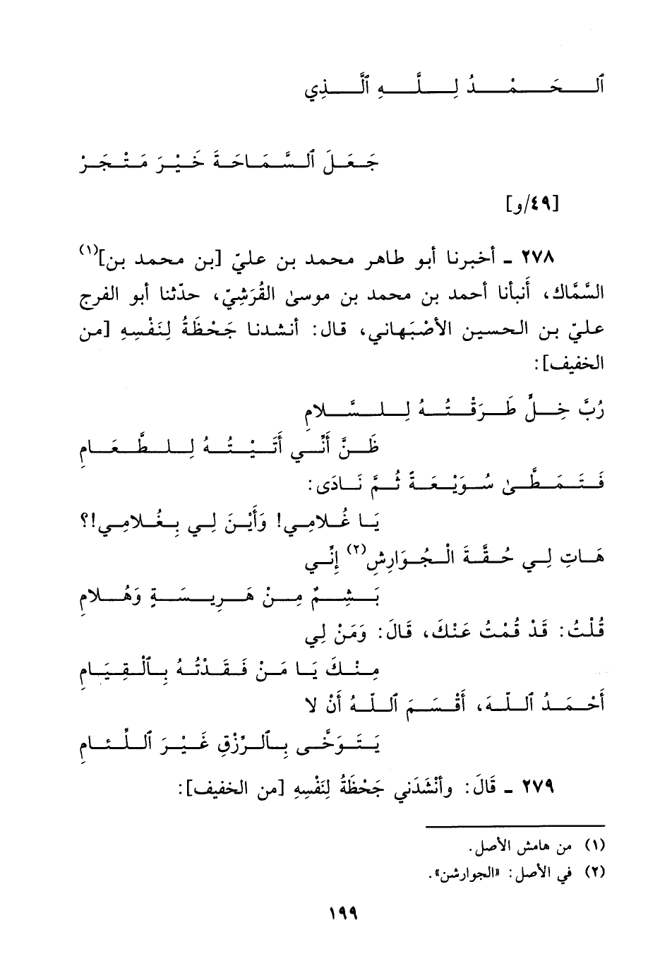 278 - أخبرنا أبو طاهر مُحَمَّد بْن علي بْن مُحَمَّد بْن السماك، أنبأنا أَحْمَد بْن مُحَمَّد بْن موسى القرشي، حَدَّثَنَا أبو الفرج علي بْن الحسين الأصبهاني، قَالَ: أنشدنا جحظة لنفسه، من الخفيف:
