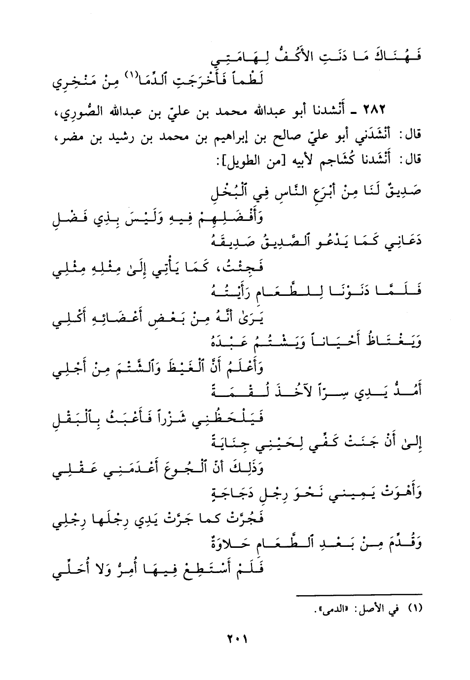 282 - أنشدنا أبو عبد اللَّه مُحَمَّد بْن علي بْن عبد اللَّه الصوري، قَالَ: أنشدني أبو علي صالح بْن إبراهيم بْن مُحَمَّد بْن رشيد بْن مضر، قَالَ: أنشدنا كشاجم، لأبيه، من الطويل: