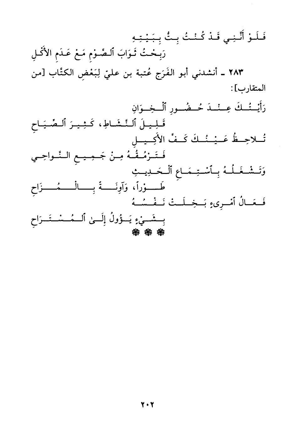 283 - أنشدني أبو الفرج عتبة بْن علي، لبعض الكتاب، من المتقارب: