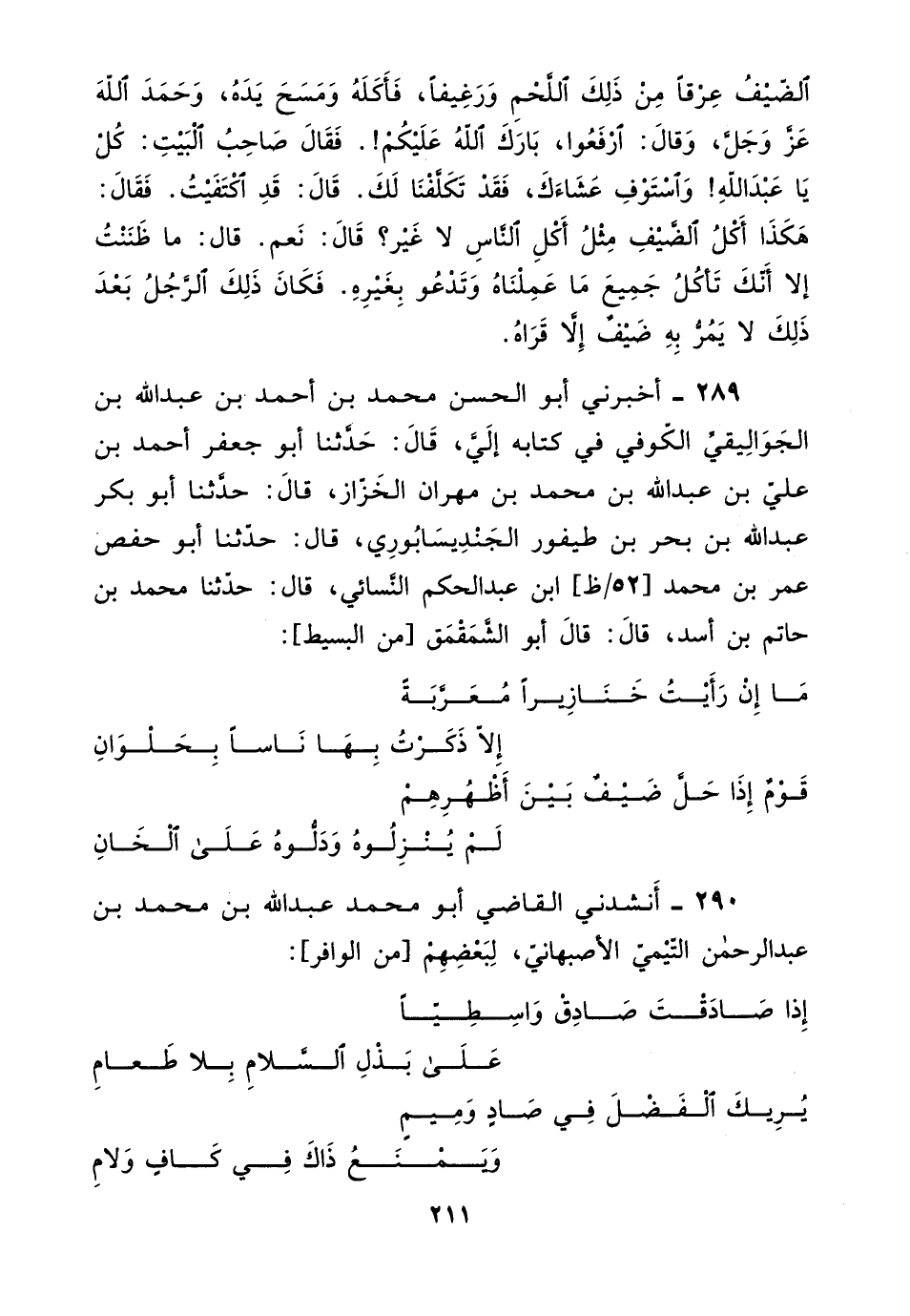 289 - أخبرني أبو الحسن مُحَمَّد بْن أَحْمَد بْن عبد اللَّه بْن الجواليقي الكوفي في كتابه إلي، قَالَ: حَدَّثَنَا أبو جعفر أَحْمَد بْن علي بْن عبد اللَّه بْن مُحَمَّد بْن مهران الخزاز، قَالَ: حَدَّثَنَا أبو بكر عبد اللَّه بْن بحر بْن طيفور الجنديسابوري، قَالَ: حَدَّثَنَا أبو حفص عمر بْن مُحَمَّد بْن عبد الحكم النسائي، قَالَ: حَدَّثَنَا مُحَمَّد بْن حاتم بْن أسد، قَالَ: قَالَ أبو الشمقمق، من البسيط: