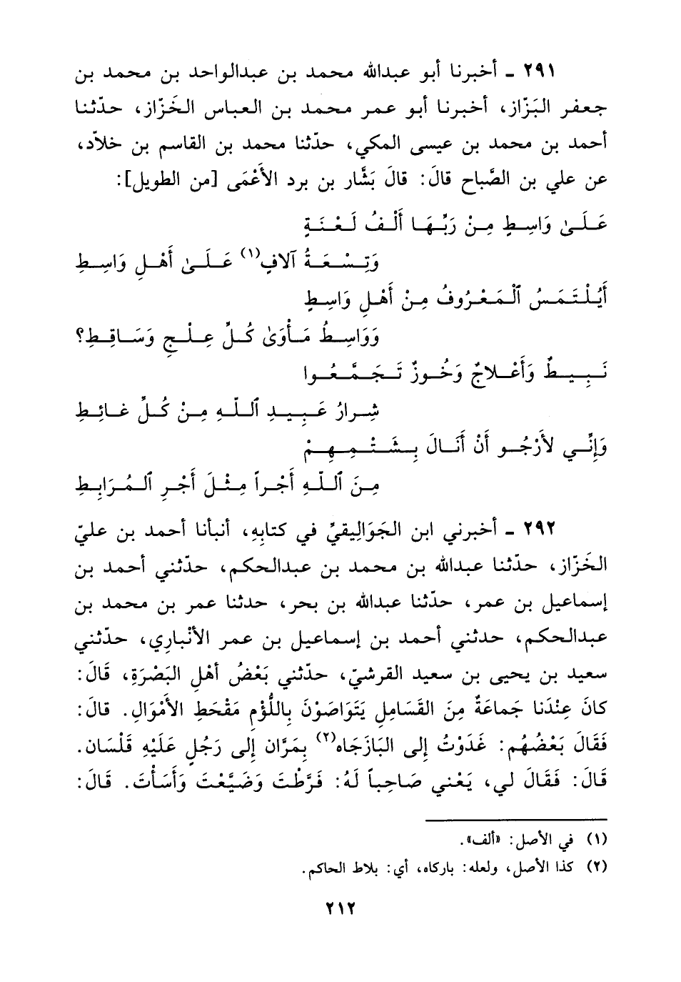 291 - أخبرنا أبو عبد اللَّه مُحَمَّد بْن عبد الواحد بْن مُحَمَّد بْن جعفر البزاز، أخبرنا أبو عمر مُحَمَّد بْن العباس الخزاز، حَدَّثَنَا أَحْمَد بْن مُحَمَّد بْن عيسى المكي، حَدَّثَنَا مُحَمَّد بْن القاسم بْن خلاد، عن علي بْن الصباح، قَالَ: قَالَ بشار بْن برد الأعمى، من الطويل: