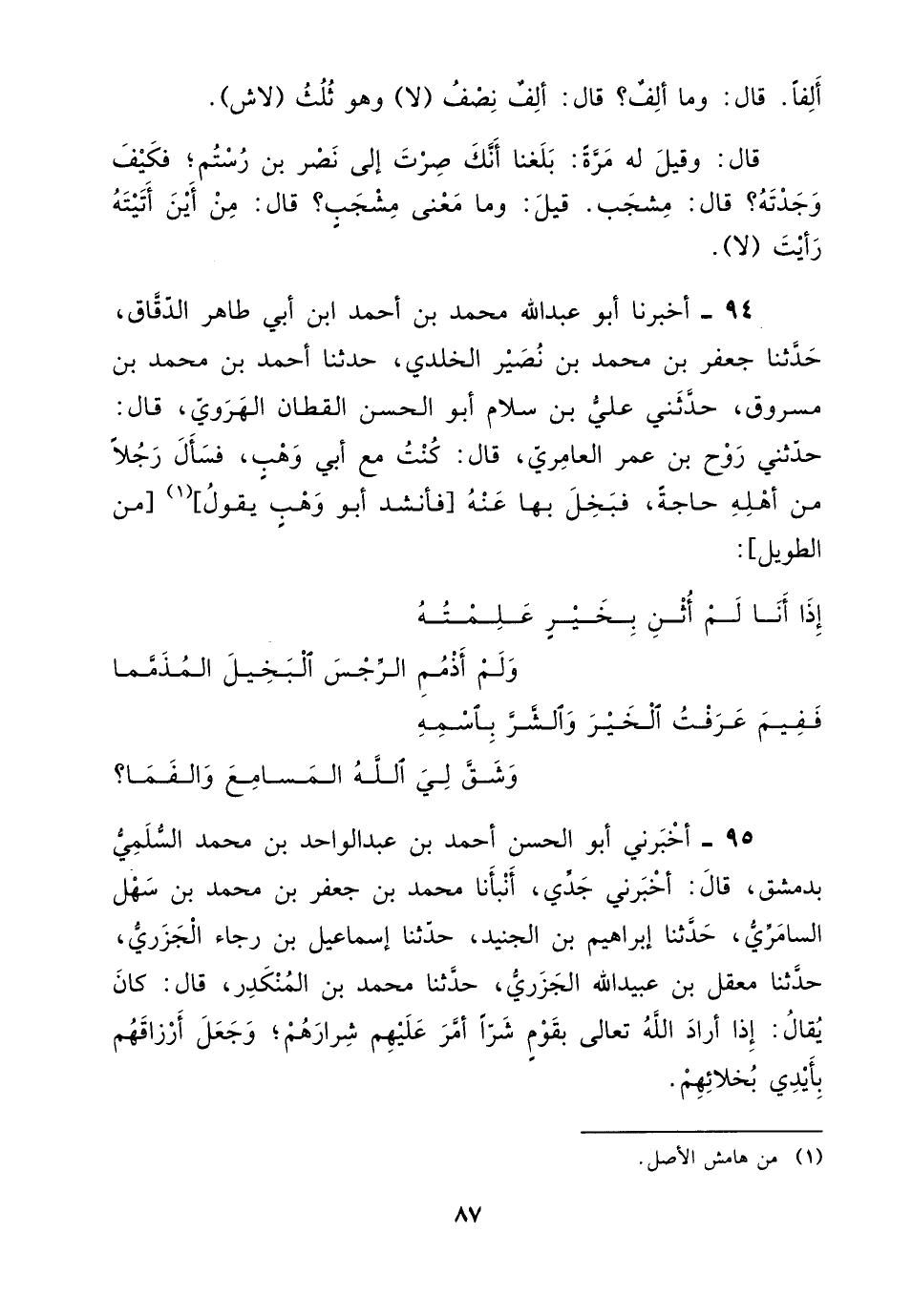 94 - أخبرنا أبو عبد اللَّه مُحَمَّد بْن أَحْمَد بْن أبي طاهر الدقاق، حَدَّثَنَا جعفر بْن مُحَمَّد بْن نصير الخلدي، حَدَّثَنَا أَحْمَد بْن مُحَمَّد بْن مسروق، حدثني علي بْن سلام أبو الحسن القطان الهروي، قَالَ: حدثني روح بْن عمر العامري، قَالَ: كنت مع أبي وهب، فسأل رجلا من أهله حاجة، فبخل بها عنه فأنشد أبو وهب، يقول، من الطويل:
