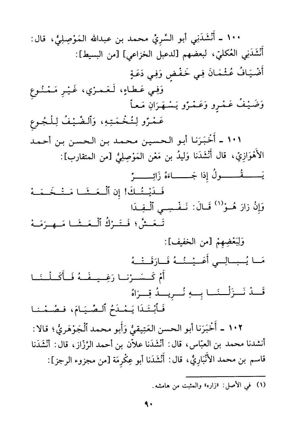100 - أنشدني أبو السرى مُحَمَّد بْن عبد اللَّه الموصلي، قَالَ: أنشدني العكلي، لبعضهم لدعبل الخزاعي، من البسيط: «