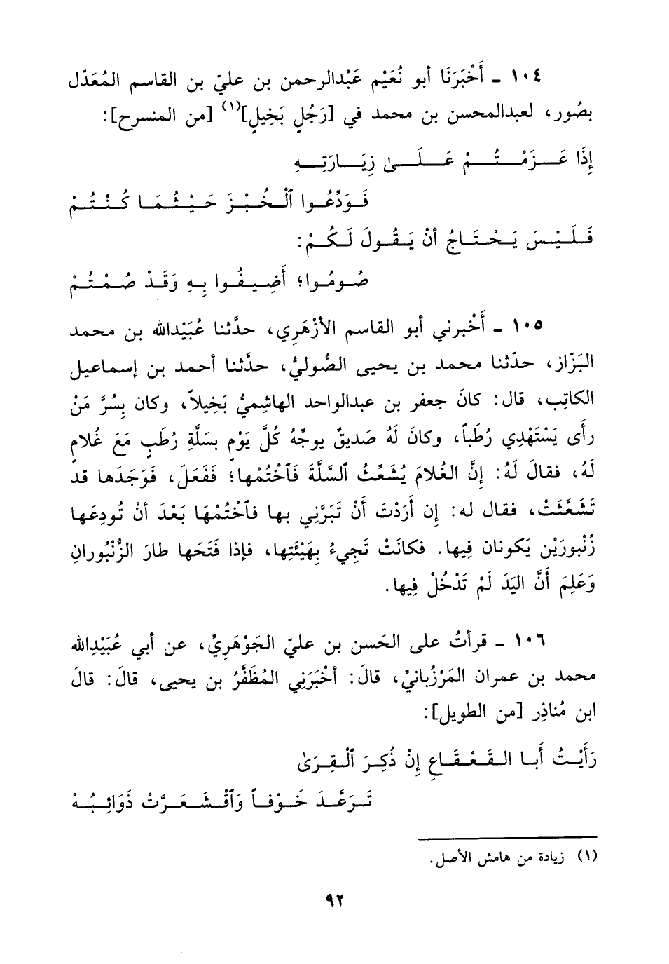 106 - قرأت على الحسن بْن علي الجوهري، عن أبي عبيد اللَّه مُحَمَّد بْن عمران المرزباني قَالَ: أخبرني المظفر بْن يحيى، قَالَ: قَالَ ابن مناذر من الطويل: «